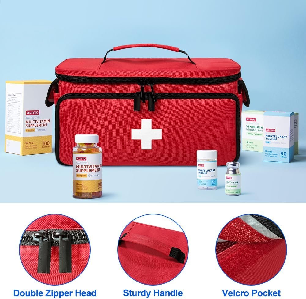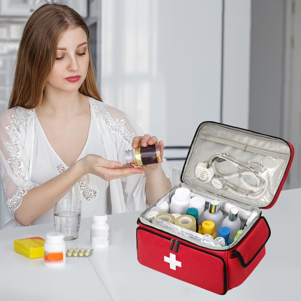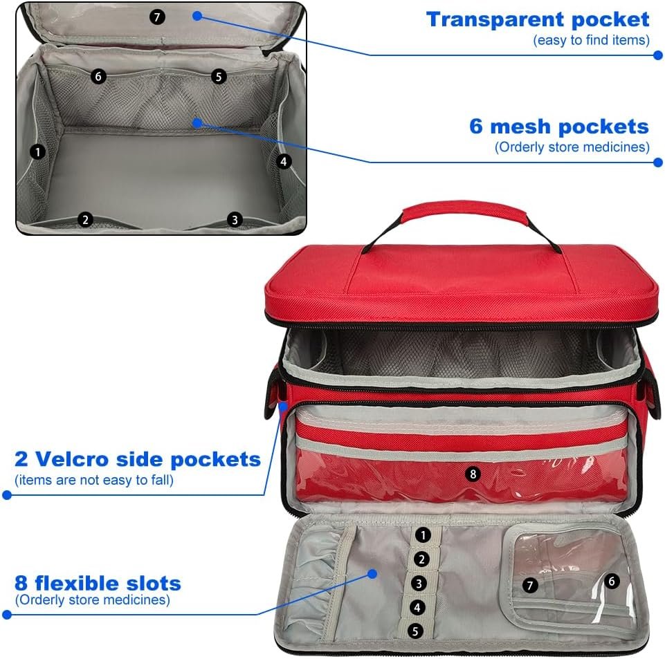 Medicine Organizer, Pill Bottle Organizer, Medical Bag Empty, Holds Pills, Vitamins and Medical Supplies for Home Storage and Travel Use, Red