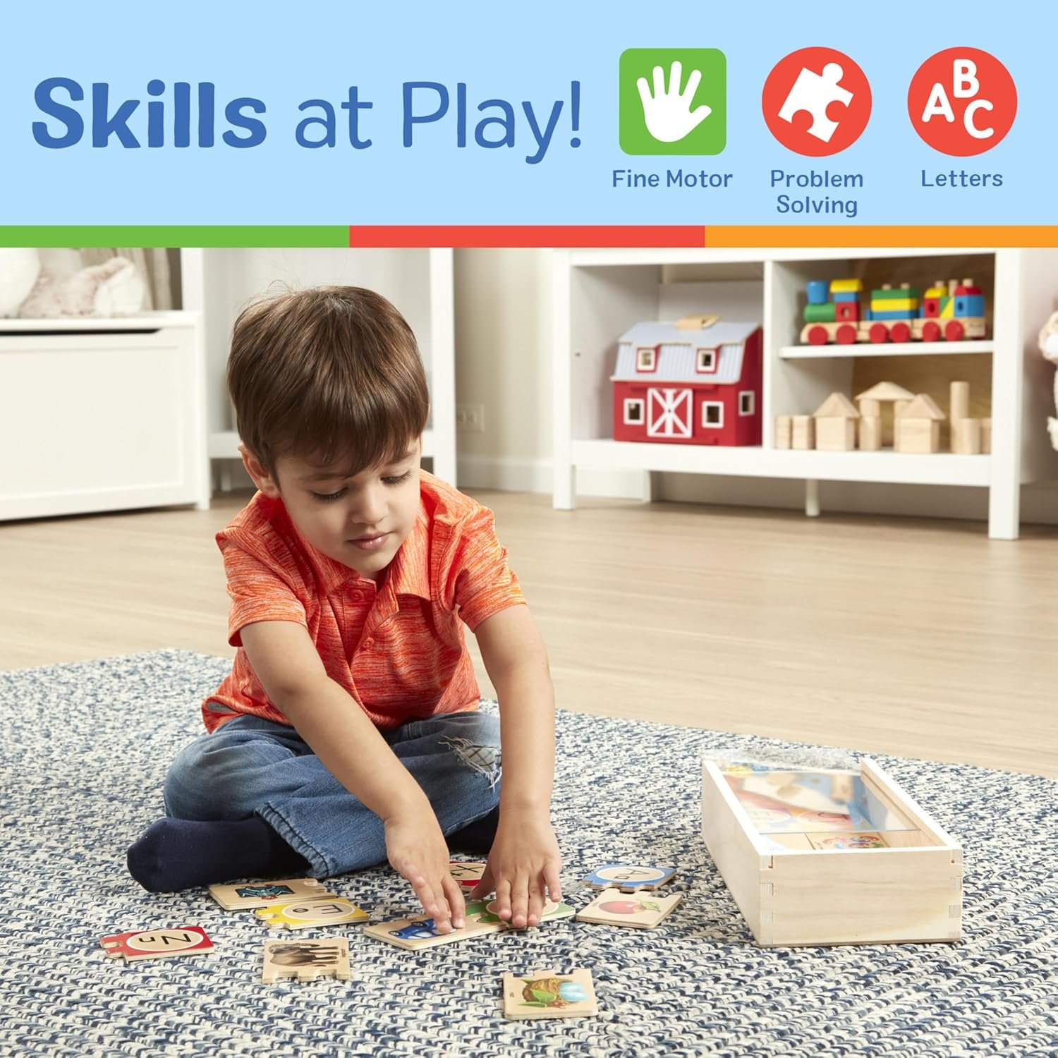 Kids can match these wooden puzzle pairs to make mastering letters as easy as A-B-C! A different object illustrates each letter of the alphabet shown in both upper and lower case, and the puzzles are self-correcting because each puzzle piece has only one match that fits. It’s a great way for children to play independently and learn at the same time. The puzzle includes 52 high-quality wooden pieces, and comes in a sturdy wooden box with a slide-in lid for easy storage and accessibility. The colorful puzzle pieces feature a familiar item to represent each letter ranging from an apple to a zebra. The Self-Correcting Alphabet Puzzles help kids practice letter recognition, matching and memory skills, eye-hand coordination, and fine motors skills. Finding the correct matching piece and solving a letter puzzle can also help kids feel a sense of pride and accomplishment. It makes a great gift for preschoolers and young learners ages four and older, for hands-on, screen-free play.
