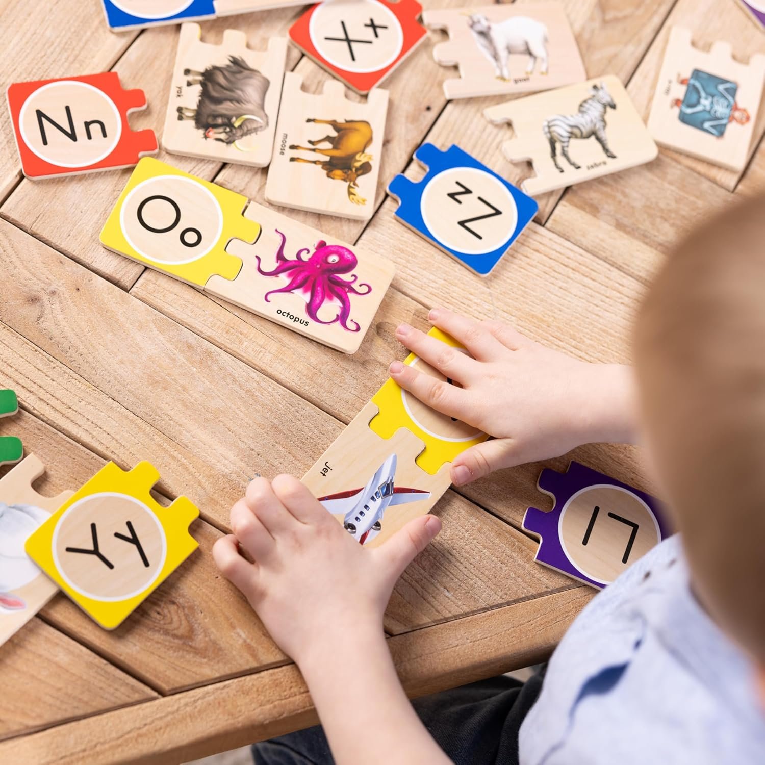 52 wooden pieces; match pieces to create the 26 letters of the alphabet