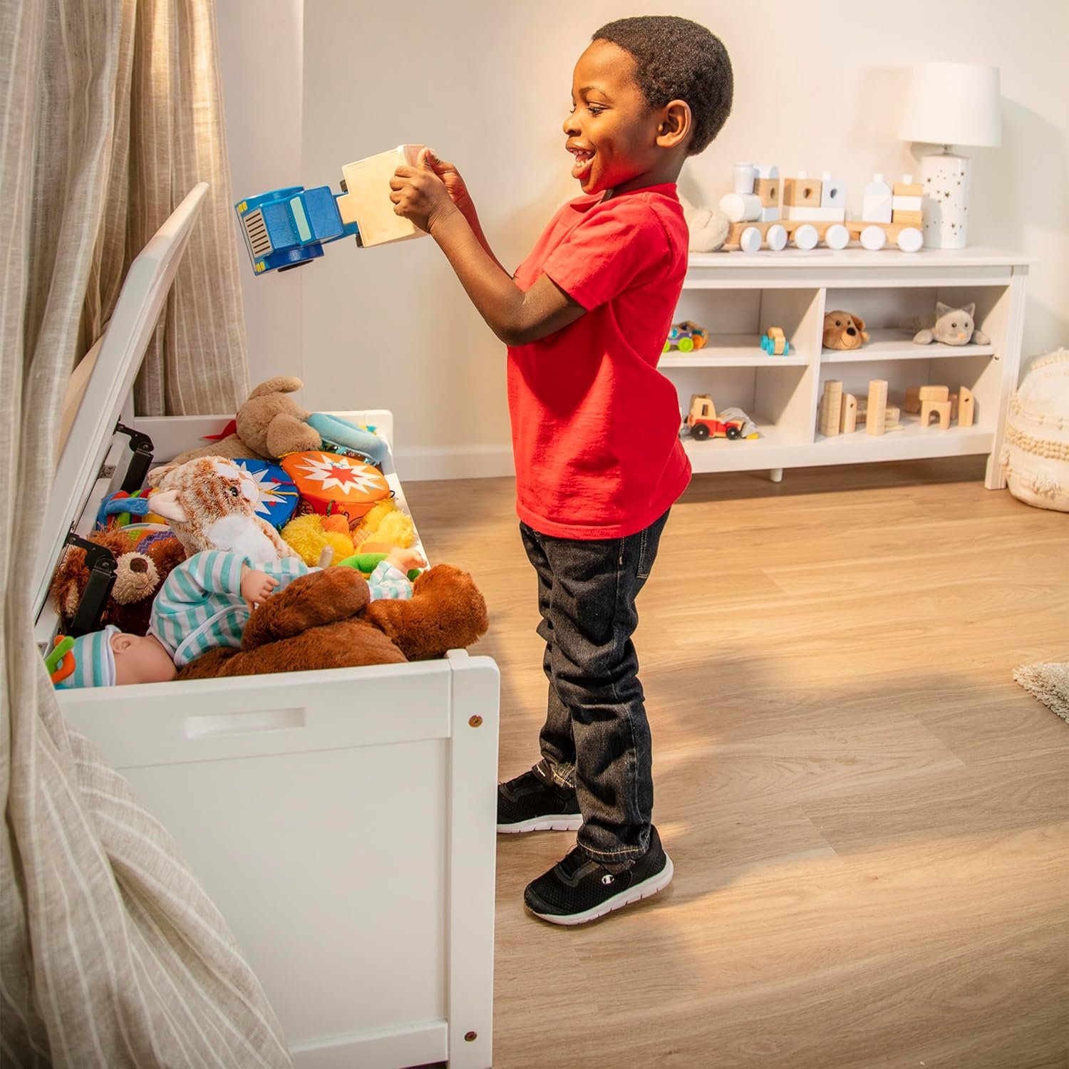 Kids will love having a handy place to store all their toys, and adults will love the classic styling and durability of this wooden toy chest! Available in honey, white, espresso, and gray finish that’s easy to wipe clean and fits with any home décor, the toy chest features 8.25 cubic feet of storage space and a safety-hinged lid. Easy to assemble with a Phillips head screwdriver, not included.