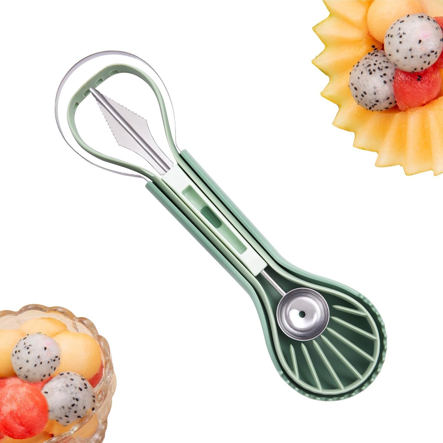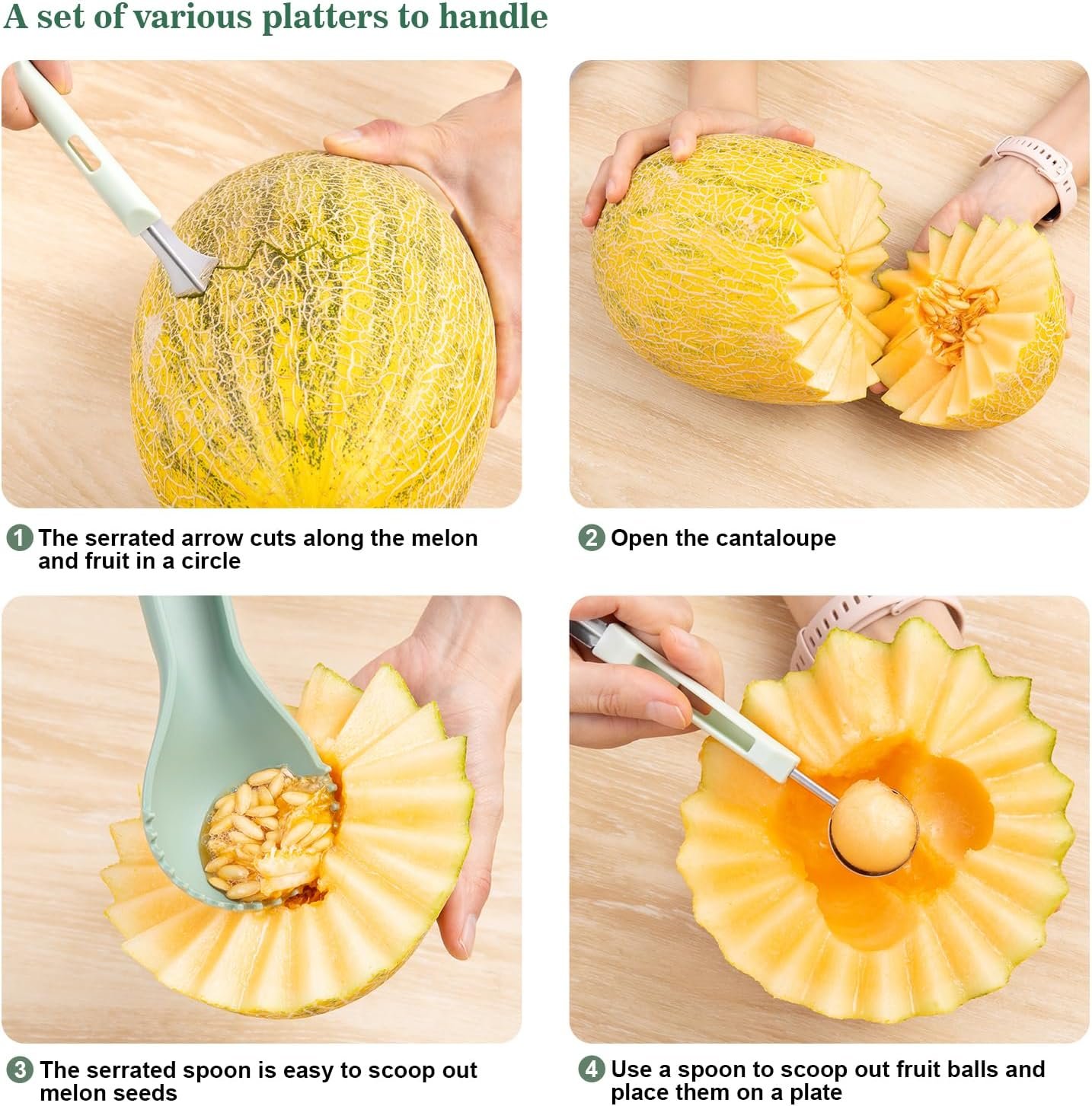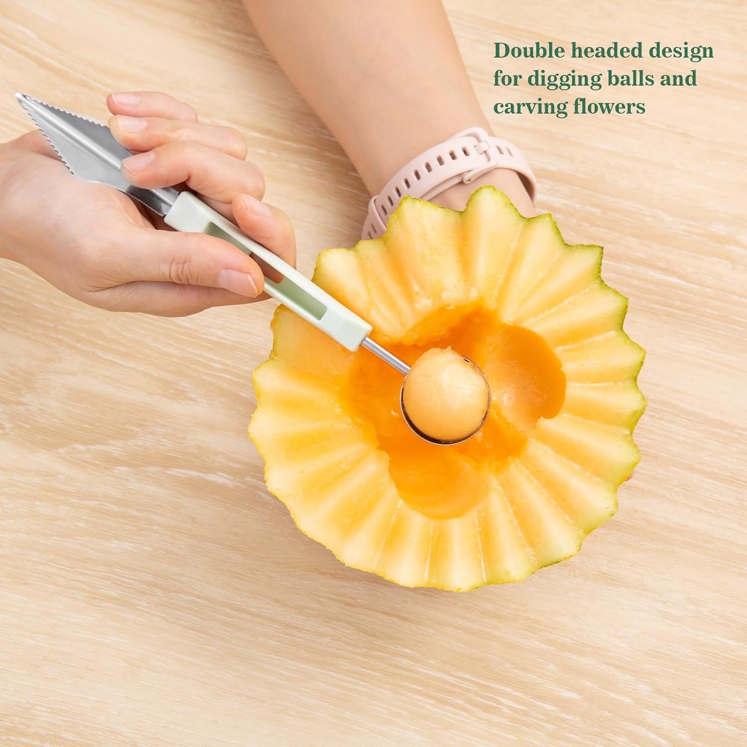 Effortless Precision:Sharp stainless steel fruit carving tools blades glide through watermelons/cantaloupes. Use the fruit cutter to craft perfect spheres or employ the slicer for uniform cubes,professional results with home-kitchen ease