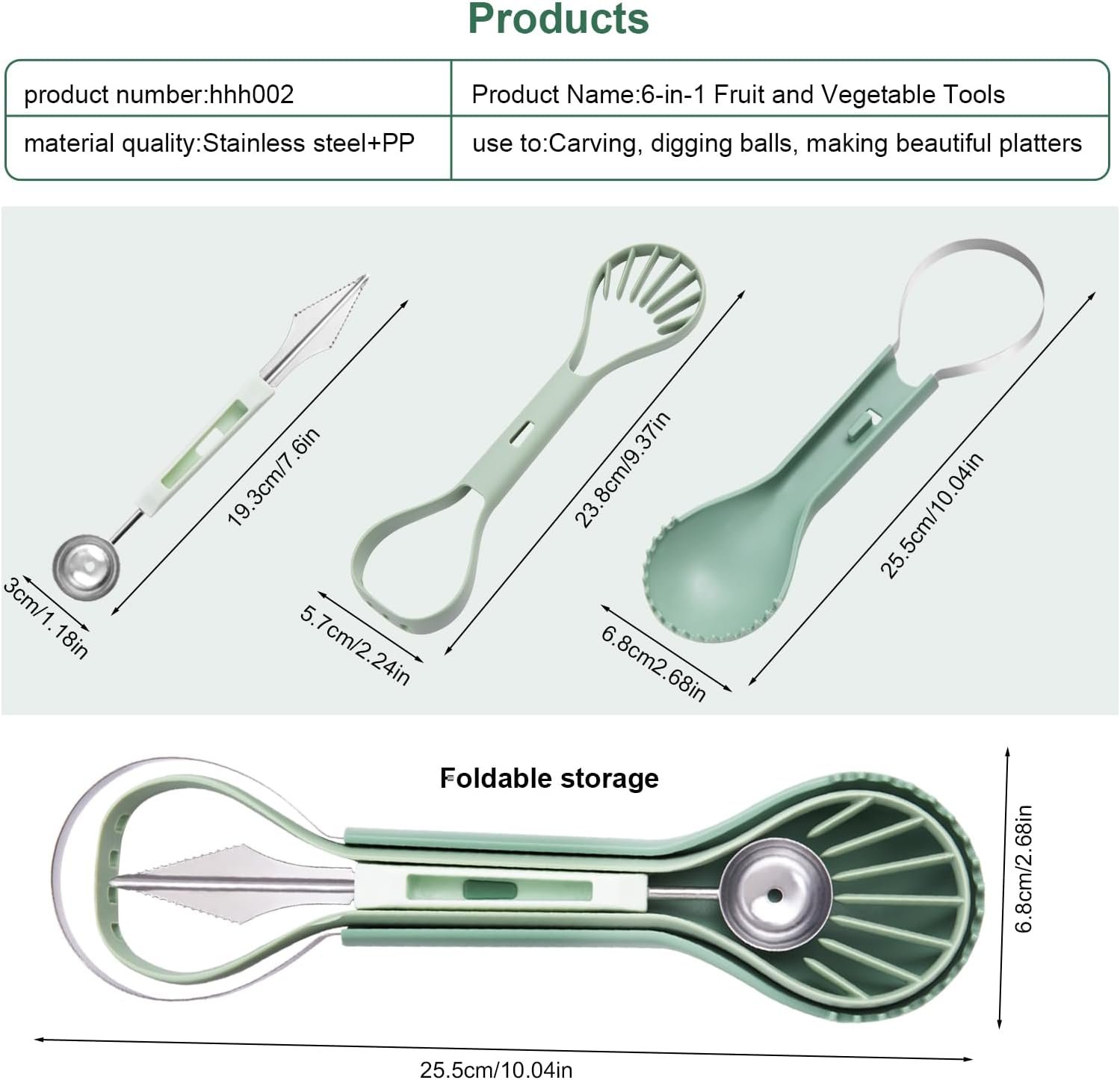 Stainless Steel Fruit Tool Set:The melon baller set features food-grade stainless steel + PP construction. Its ergonomic fruit cutters handle ensures slip-resistant grip, while polished edges guarantee burr-free safety for smooth fruit carving