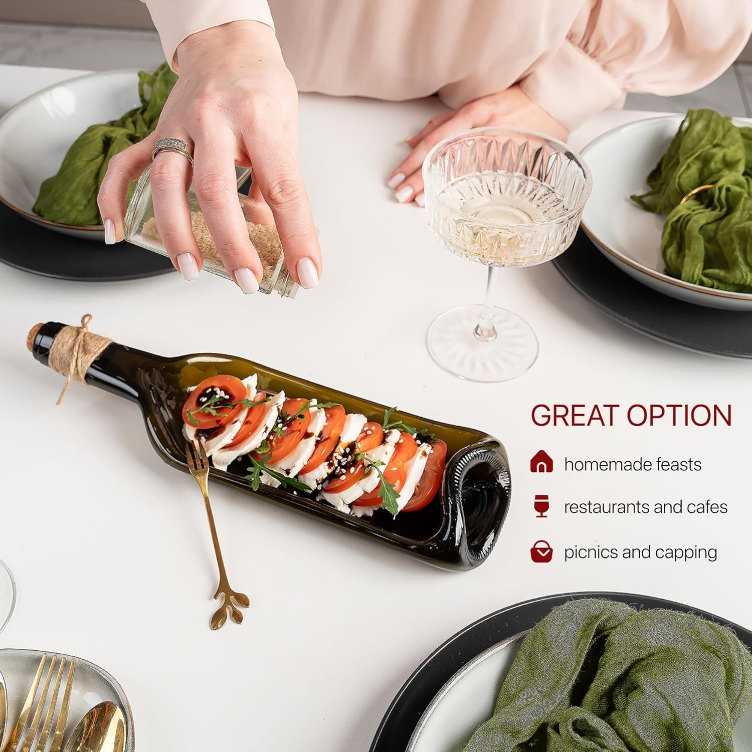 VERSATILE USE: The melted wine bottle tray is incredibly versatile. It can be used for serving a variety of appetizers such as cheeses, meats, fruits, chips, or nuts. They can withstand the demands of daily use, from cracker trays for serving appetizers to being used as a trinket, jewelry or candle tray. Its sleek and flat design allows for a stable presentation of items, making it the perfect decorative accent for your coffee table.