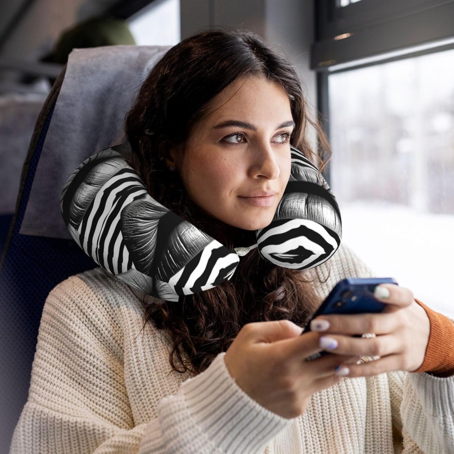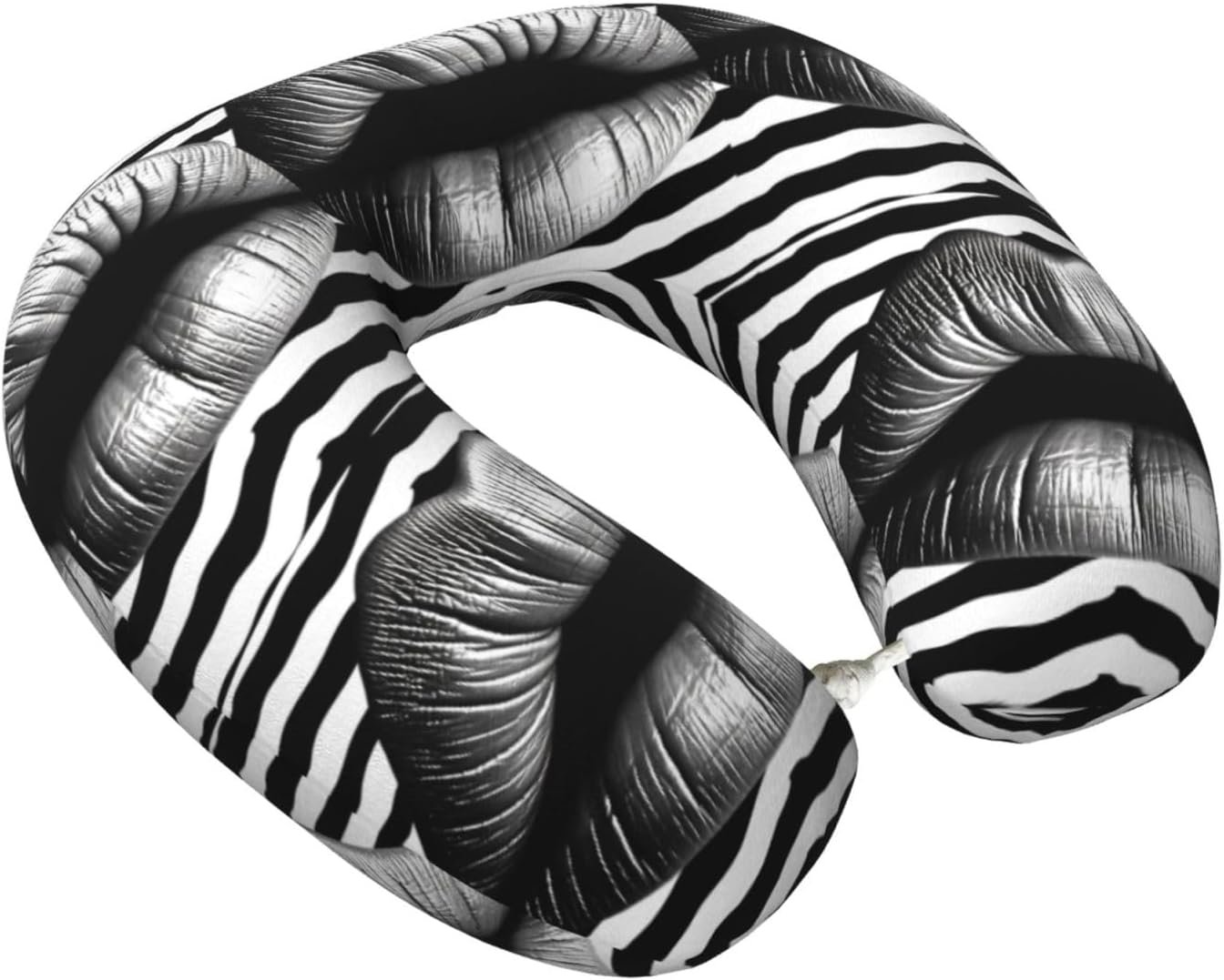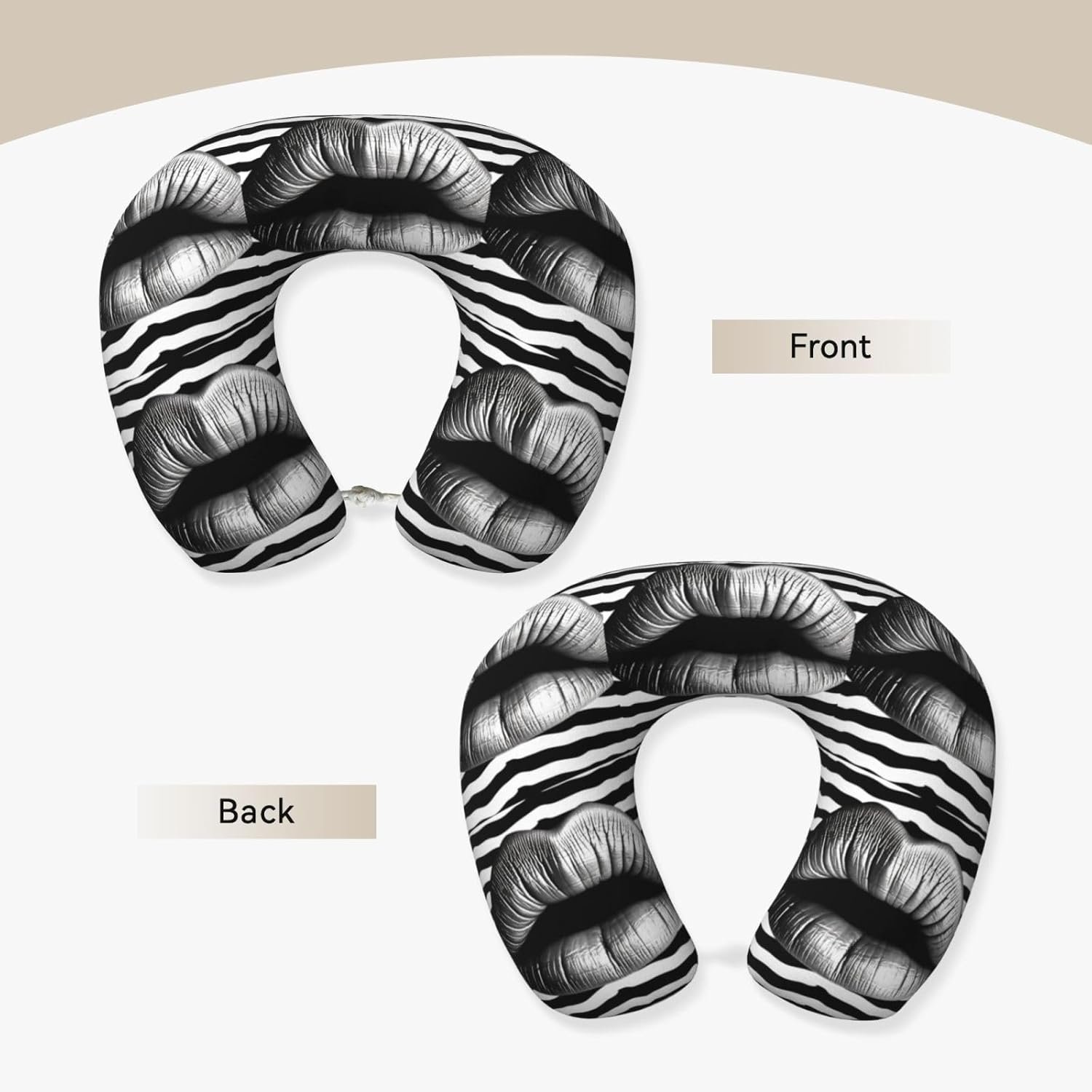 Memory Foam Travel Pillow Soft U-Shaped Neck Pillow Comfortable Lips Printed in Black and White Stripes Head Support Pillow Travel Accessories for Sleeping Rest Airplane Car and Office