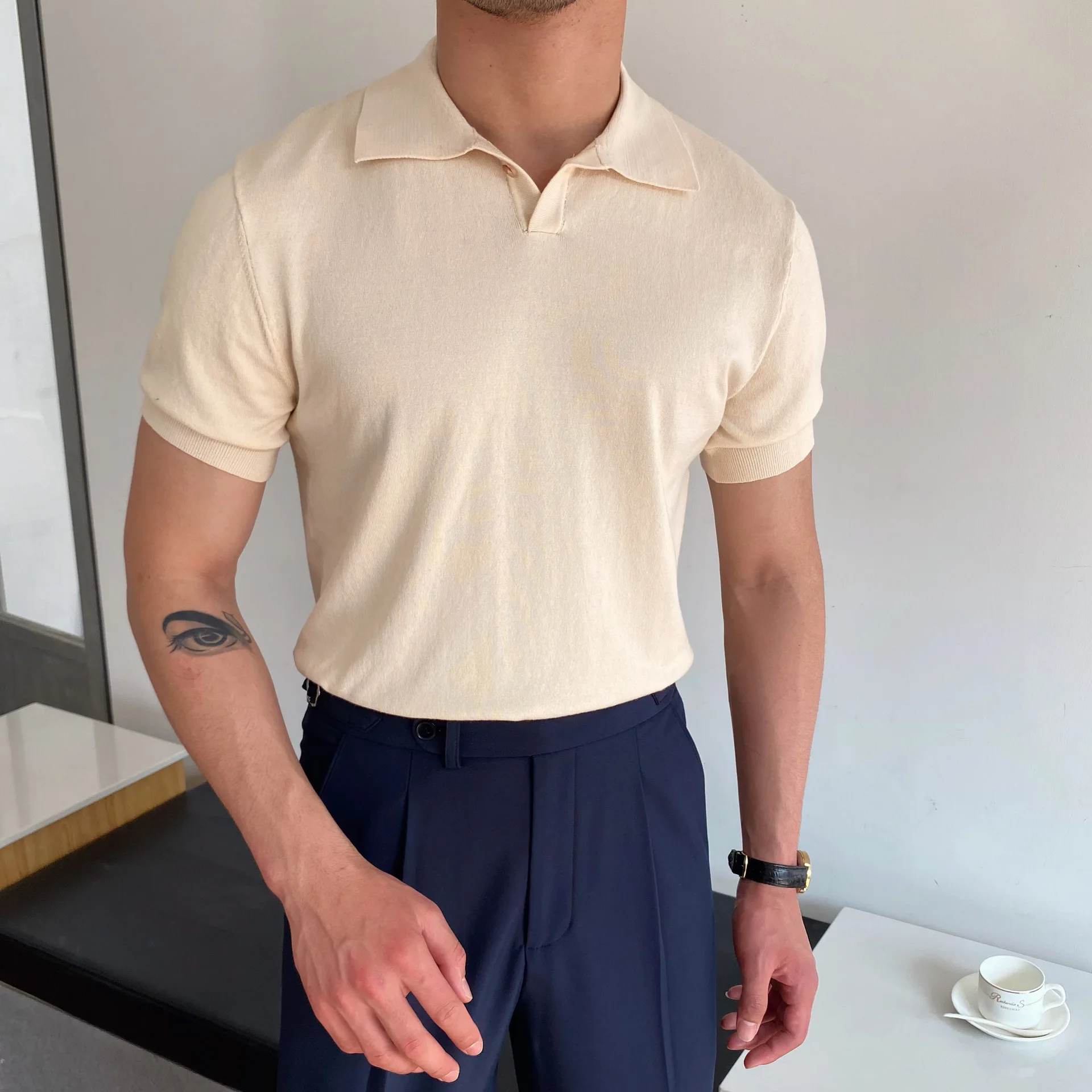 Men’s Polo Shirt Elbow-Sleeved T-shirt Fashion Polo Collar Slim-Fit Men Clothing Woolen Sports Polo Tee Shirt Man Golf Shirt EUR