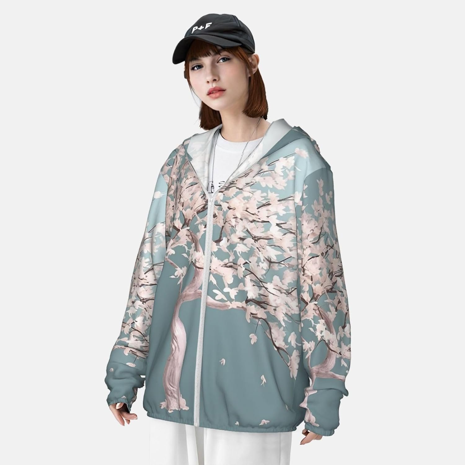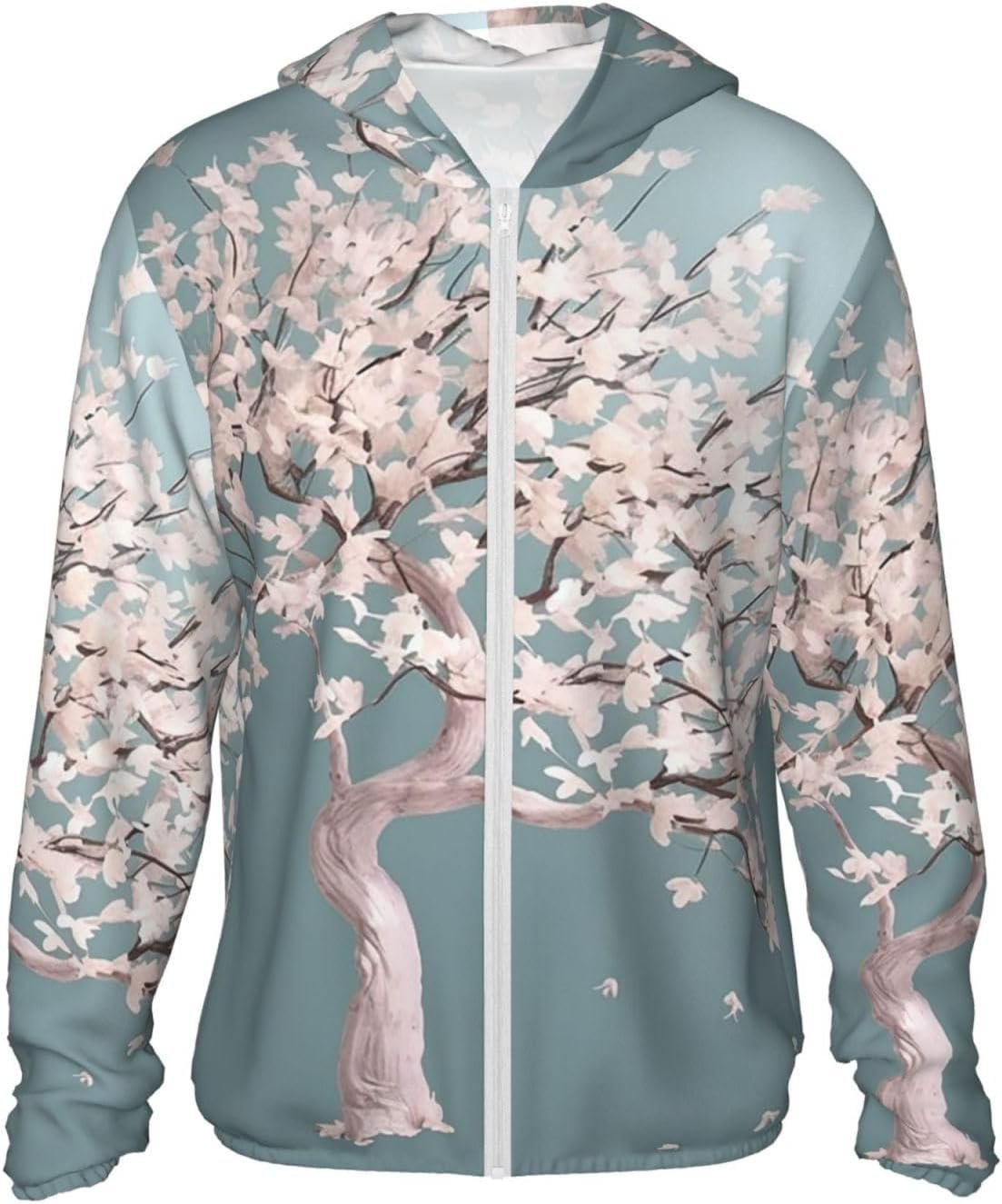 Men’s UPF 50+ Sun Protection Hoodie Jacket Large Cherry Blossom Tree Lightweight Long Sleeve Quick Dry Rash Guard Sun Shirt for Fishing 3X-Large