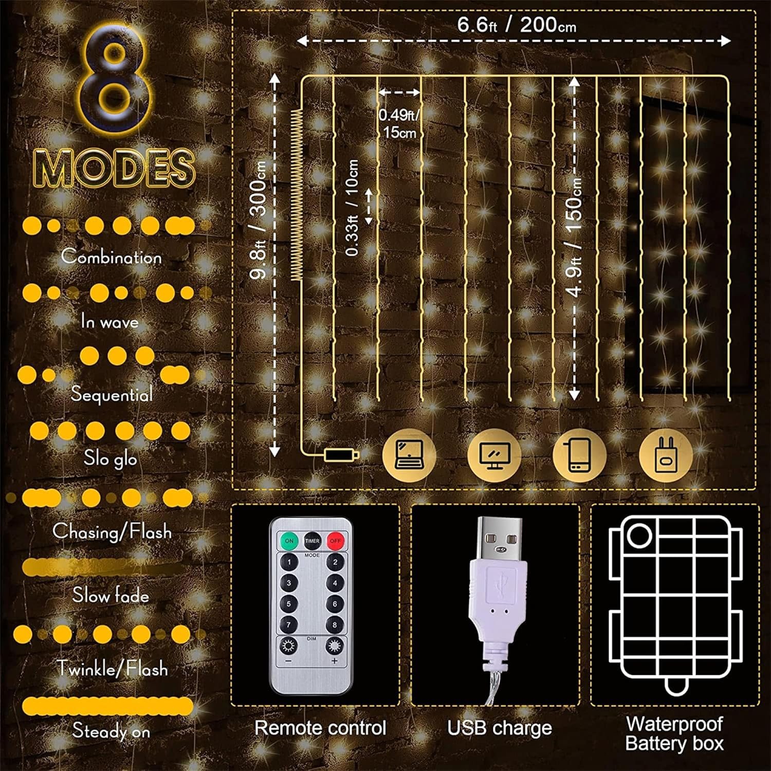 [8 Modes Settings and Auto Timer] these LED curtain string lights come with remote control with 8 light modes: combination, waves, sequential, slow glow, chasing/flash, slow flash, twinkle/flash and steady on. The fairy curtain lights also have a memory function, convenient for your next use, easy to set up and with nice brightness, ideal for Christmas curtain decor, add a nice touch to your Christmas; Note: remove the insulating gasket before use the remote control