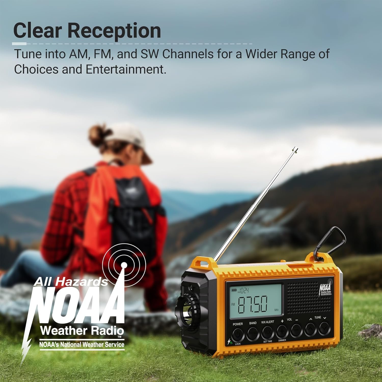 【Rechargeable Radio Portable 𝟱 𝗪𝗮𝘆 𝗣𝗼𝘄𝗲𝗿𝗲𝗱 with Built-in 𝟭𝟮𝟬𝟬𝟬𝗺𝗔𝗵 𝗟𝗶-𝗶𝗼𝗻 𝗕𝗮𝘁𝘁𝗲𝗿𝘆】The noaa weather radio comes with 44400mWh large-capacity rechargeable battery. You can 𝗹𝗶𝘀𝘁𝗲𝗻 𝗳𝗼𝗿 𝟲𝟬 𝗵𝗼𝘂𝗿𝘀 nonstop, 𝗰𝗵𝗮𝗿𝗴𝗲 𝘆𝗼𝘂𝗿 𝗽𝗵𝗼𝗻𝗲 𝗺𝗼𝗿𝗲 𝘁𝗵𝗮𝗻 𝘁𝘄𝗶𝗰𝗲 in emergency, so as to get in touch with your family or friends, receive help from rescuers. When the energy runs out, there are 4 backup power sources including 𝘁𝘆𝗽𝗲 𝗖 𝗶𝗻𝗽𝘂𝘁, 𝗔𝗔𝗔 𝗯𝗮𝘁𝘁𝗲𝗿𝗶𝗲𝘀, 𝗵𝗮𝗻𝗱 𝗰𝗿𝗮𝗻𝗸, 𝗮𝗻𝗱 𝘀𝗼𝗹𝗮𝗿 𝗽𝗮𝗻𝗲𝗹. With the survival radio, never worry about power-off.