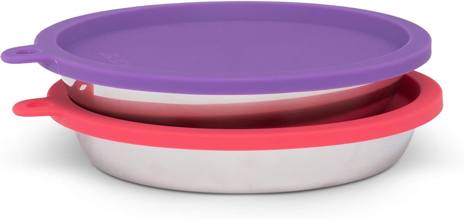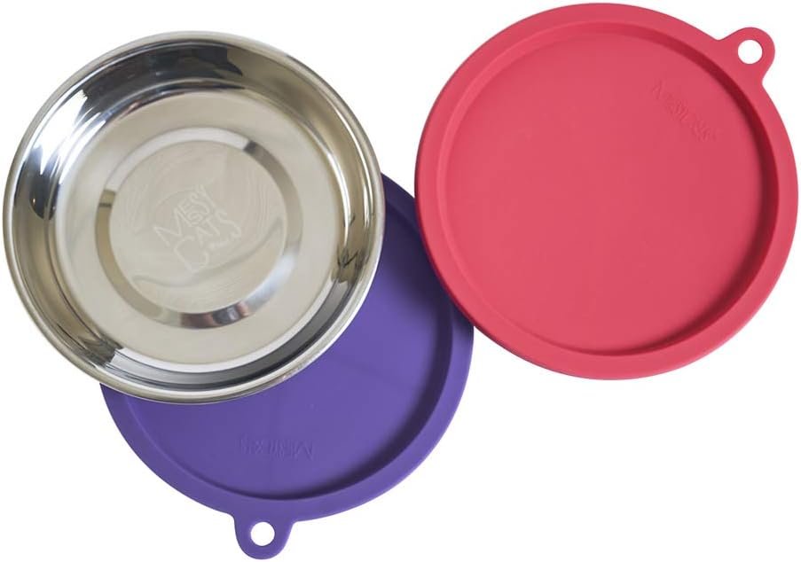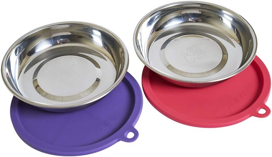 Messy Cats 4pc Set with Two Stainless Saucer Shaped Bowls and Two Silicone Lids, 1.75 Cups Per Bowl, Watermelon and Purple Lids