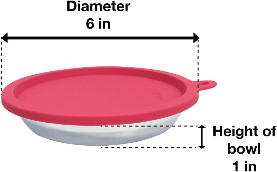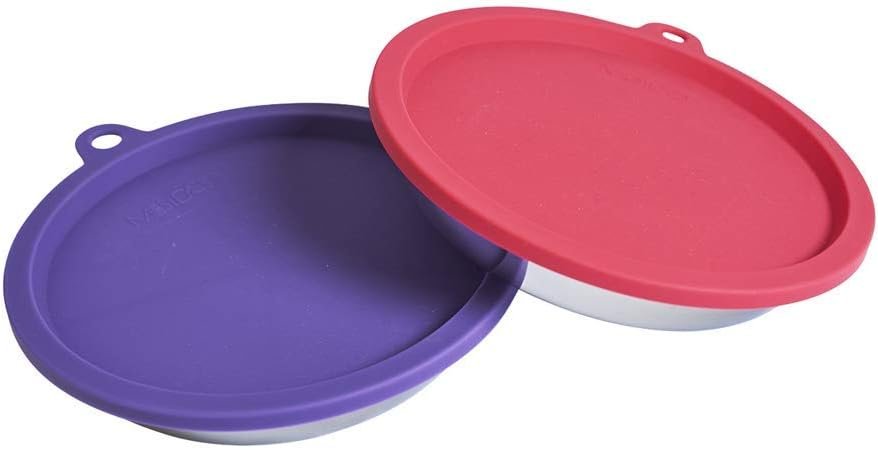 Each set contains two saucer shaped stainless steel bowls (14oz / 1.75 cups per bowl, 6″ d x 1″ h) and two silicone lids (6” d).