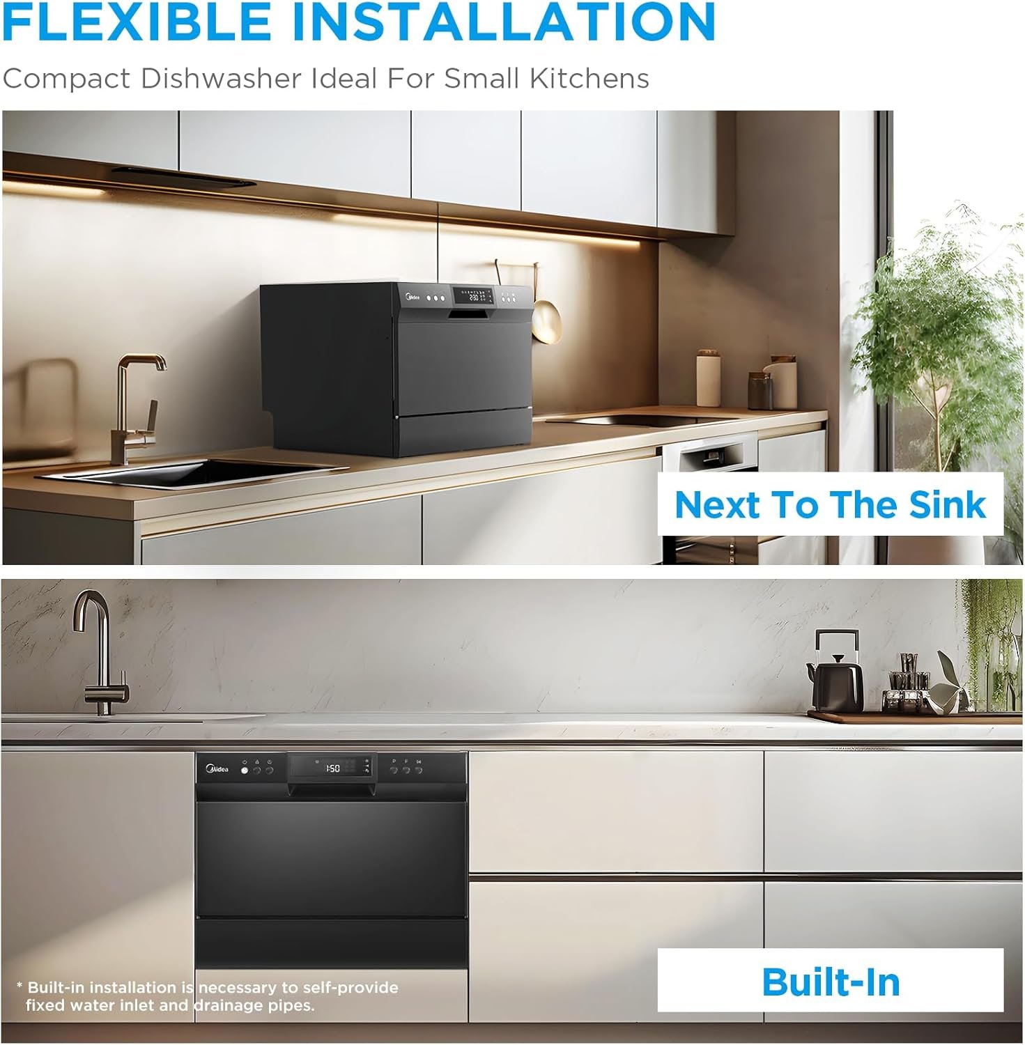【Simple Installation】- Midea portable dishwasher can be connected to faucet directly (Suitable adaptor needed). Depending on your needs, it can be flexibly placed on the table or fitted in the cupboard.
