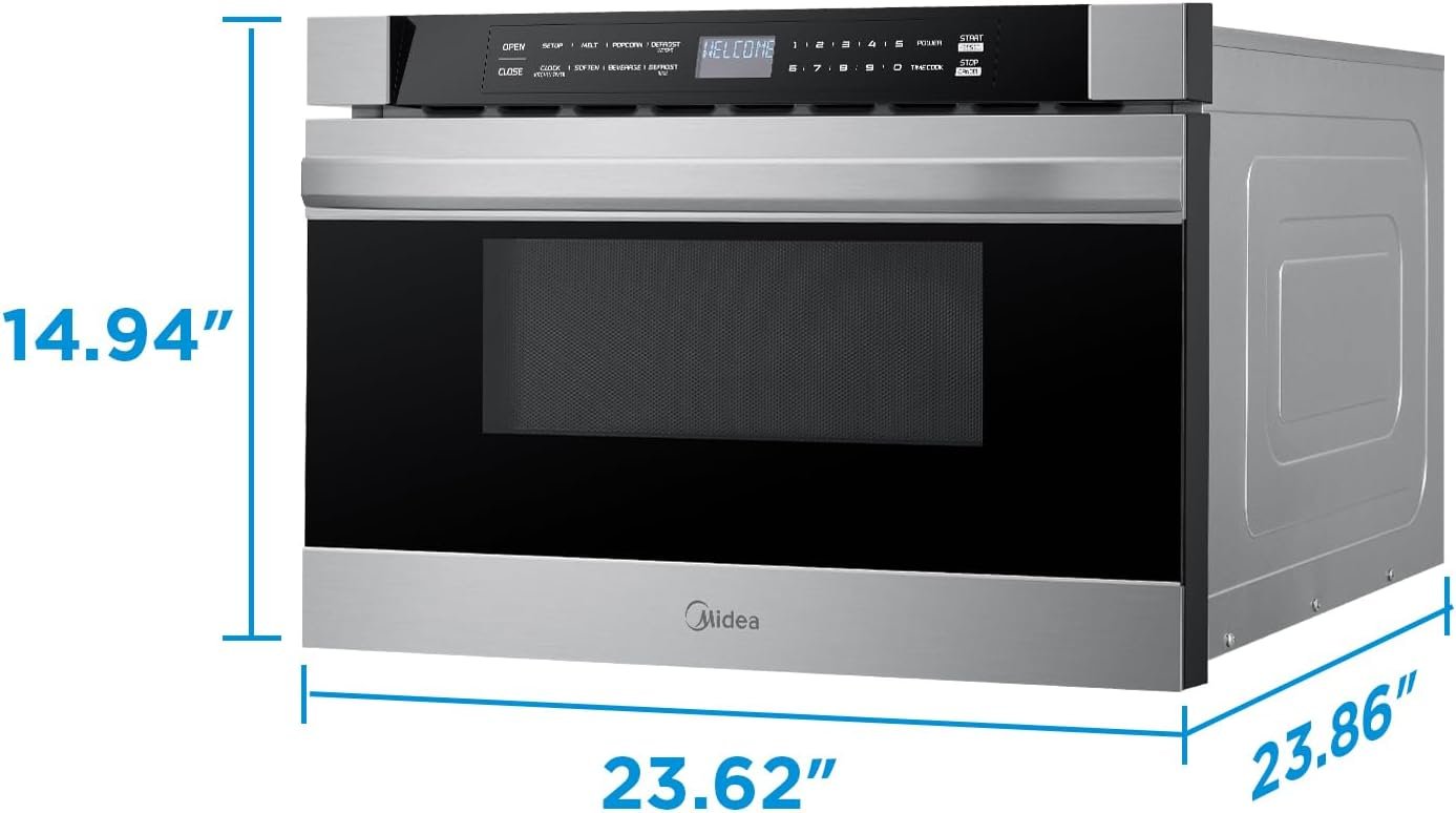 Midea Microwave Drawer, your ultimate kitchen companion. With a powerful 1000W and 11 power levels control, experience precise cooking control for perfect results. The spacious 1.2 cu. ft. capacity accommodates various dish sizes, while the intuitive one-touch start simplifies operation. Effortlessly defrost by weight or time and enjoy convenient auto-menus. The easy clean cavity ensures simple maintenance, and the child-lock function provides enhanced safety. Upgrade your kitchen with the versatile and powerful MIDEA Microwave Drawer for effortless cooking and a cleaner kitchen environment.