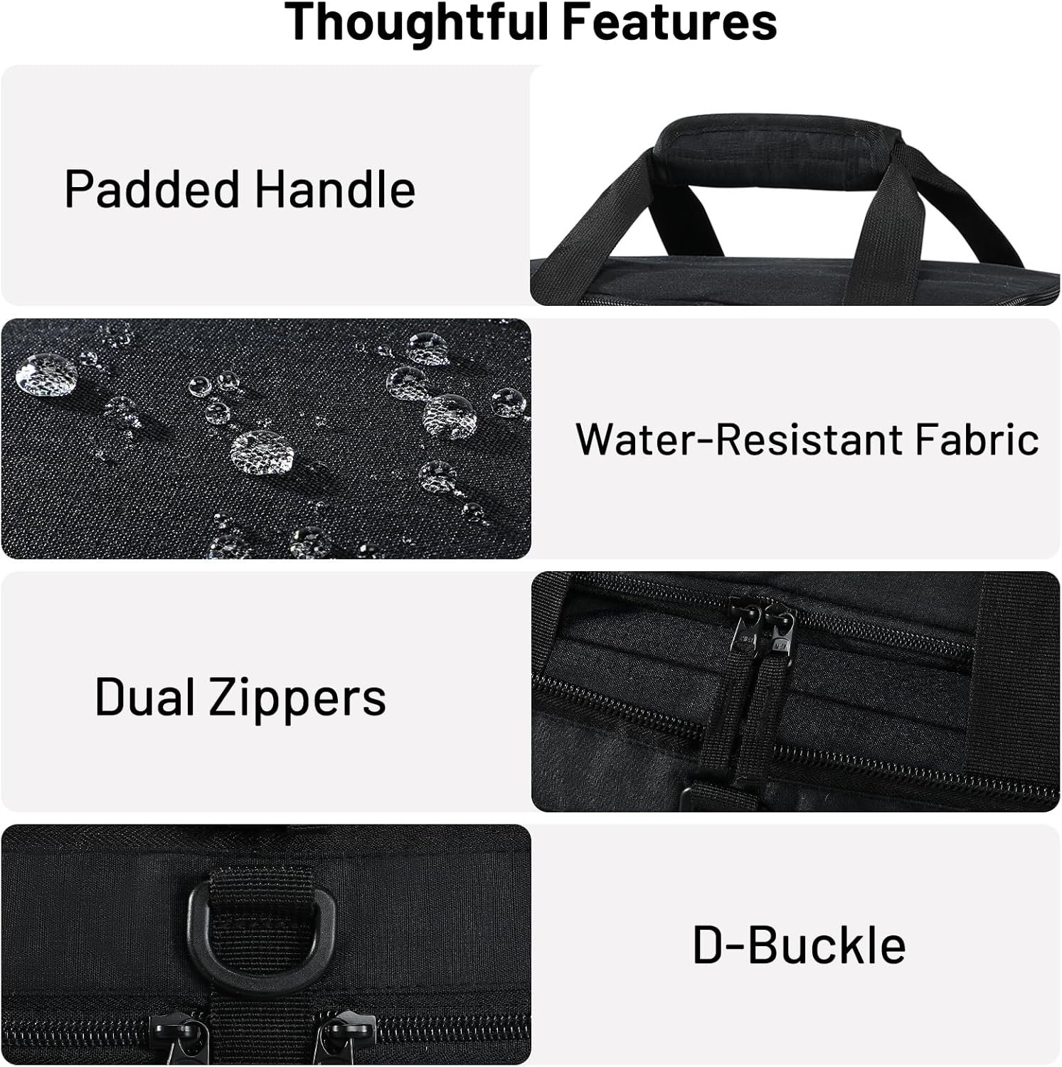 Lightweight & Durable: Made of water-resistant, tear-proof fabric with smooth-gliding zippers. Padded handle and a detachable adjustable shoulder strap ensure comfort. A side handle provides multiple carrying options
