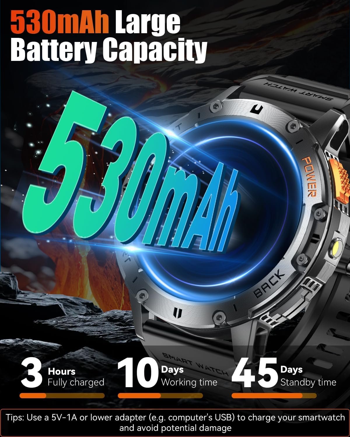【530mAh Battery & Built-In Flashlight】 Equipped with a military-grade 530mAh battery, this smartwatch offers 5-10 days of use and up to 45 days of standby on just 2-3 hours of charging. It also features a built-in flashlight, making it an essential tool for camping, hiking, and nighttime activities. Whether you’re in an emergency or need extra light during car troubles, this smartwatch ensures you’re always prepared.
