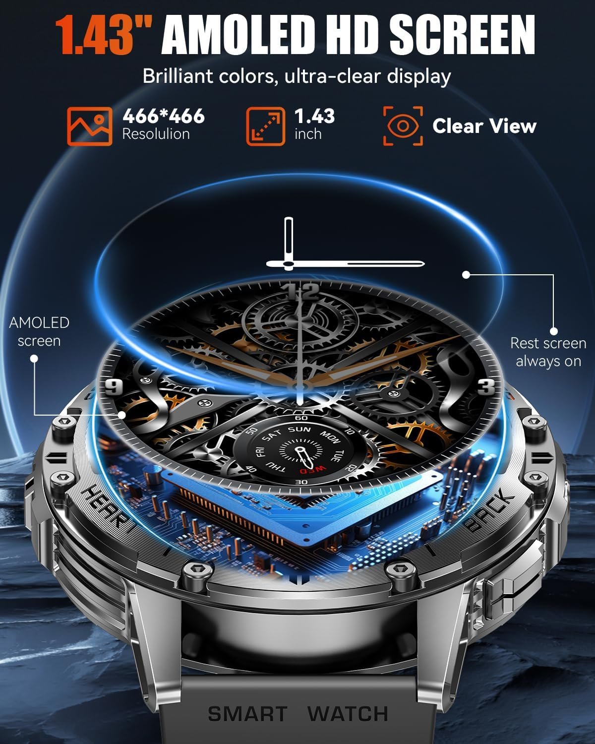 Military Smart Watches for Men with Bluetooth Call, 1.43″ AMOLED Waterproof Smartwatch with Flashlight, 111 Sport Modes, 530mAh Heart Rate/SpO2/Sleep Monitor Fitness Tracker for Android iOS