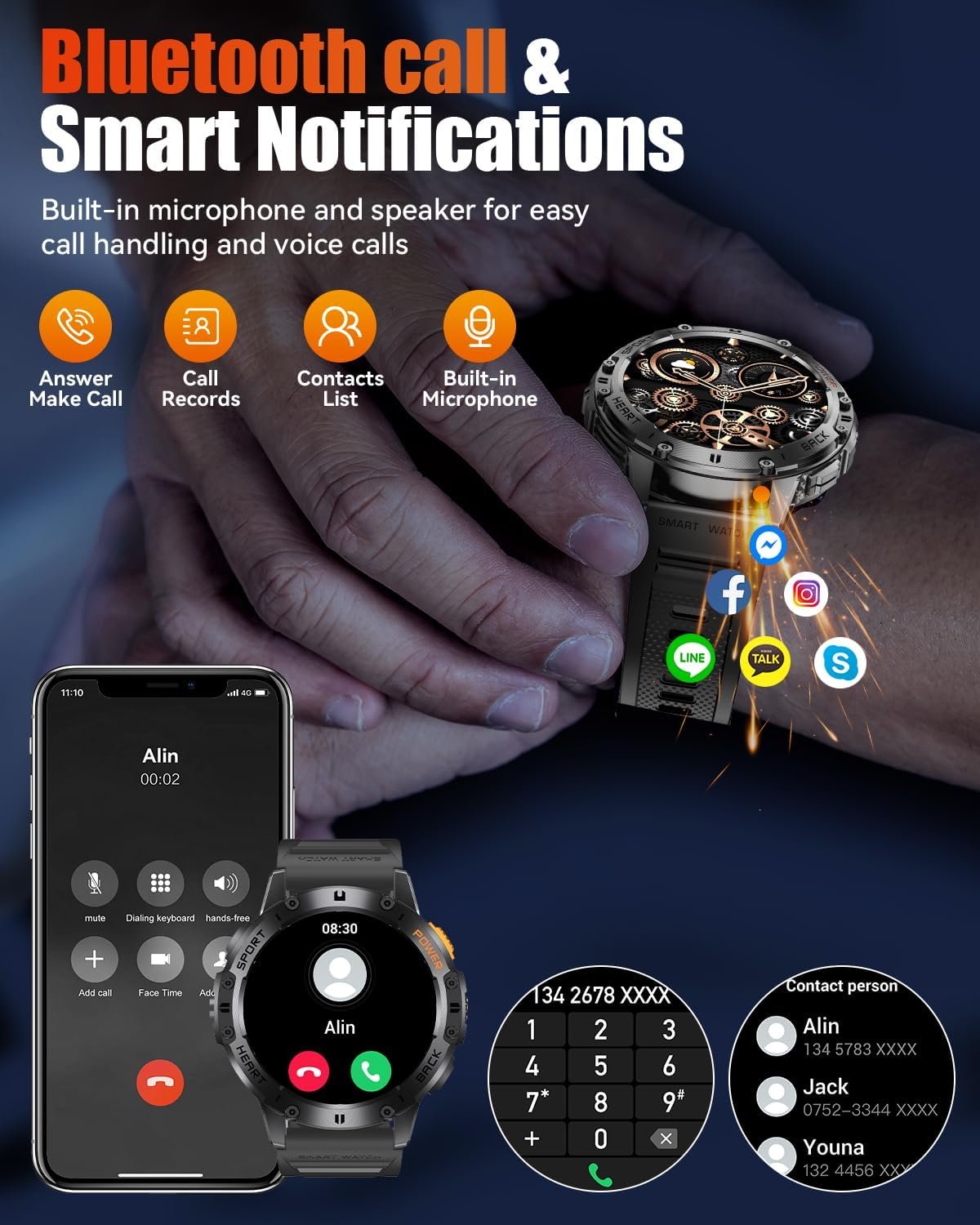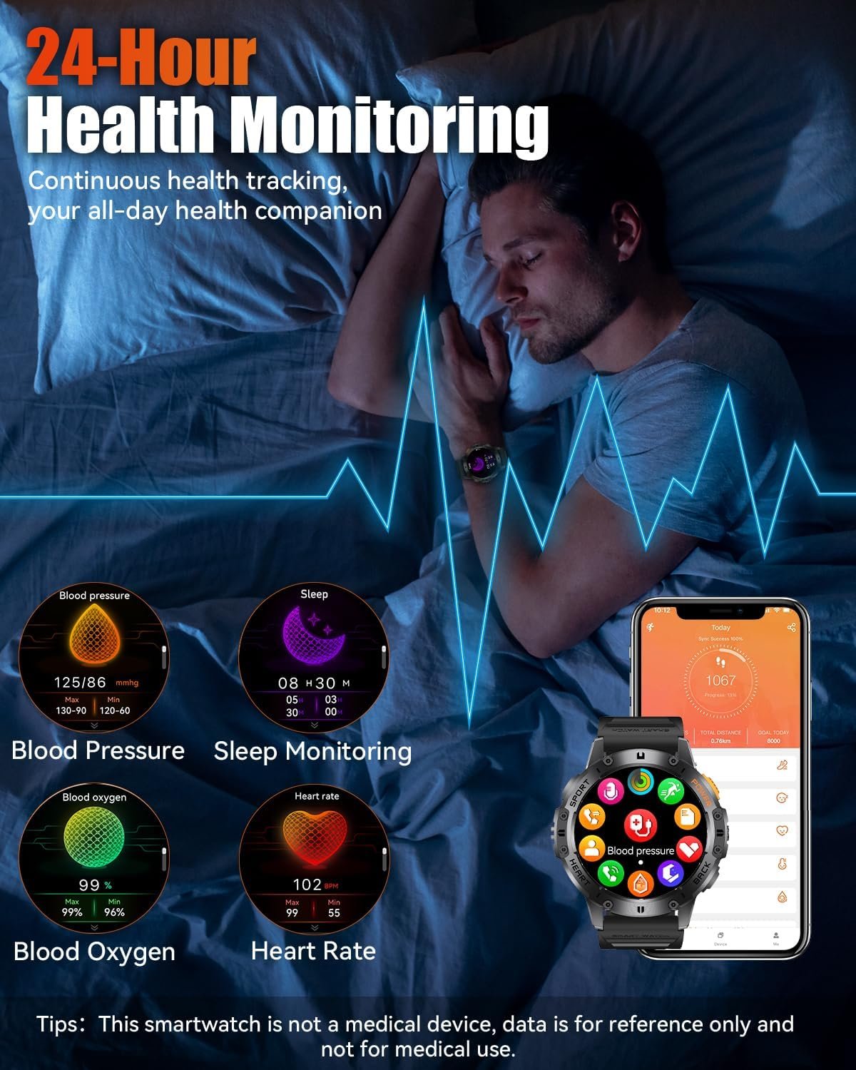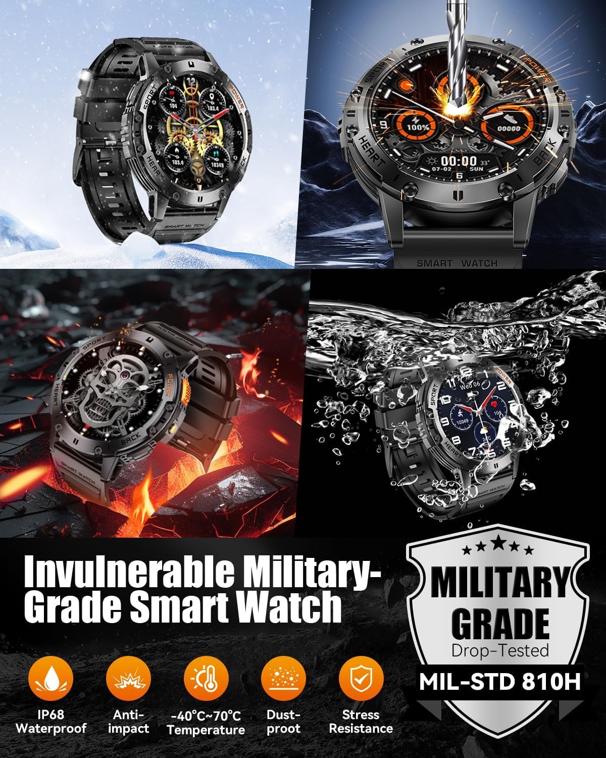 【Military-Grade Durability & IP68 Waterproof】 This Military-grade smartwatch built to withstand the toughest environments, Designed for extreme temperatures, dust resistance, and salt spray, it guarantees durability against shocks, water, and dust. With an IP68 waterproof rating, it’s perfect for everyday use like handwashing, showering, or rainy hikes, making it a reliable companion for both outdoor adventures and rugged work conditions.