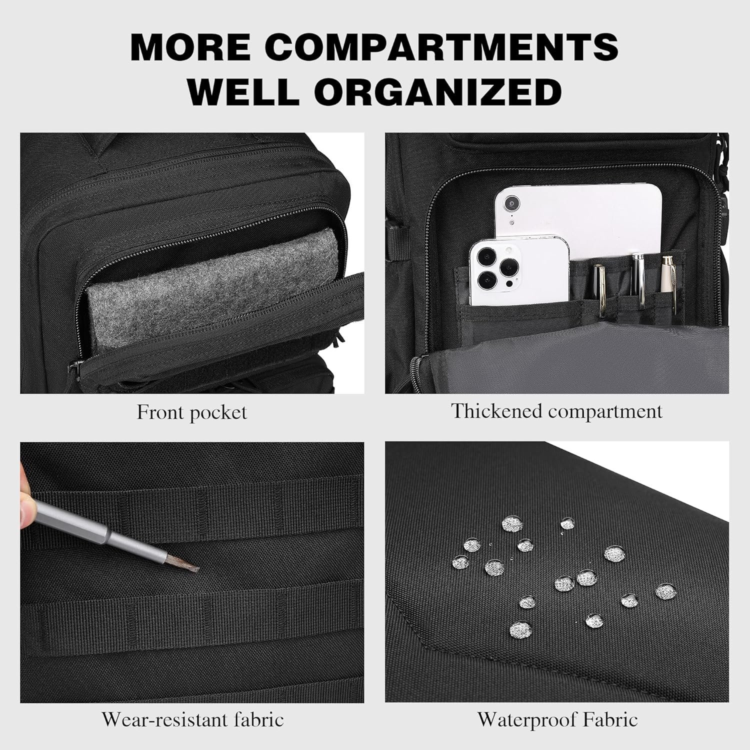 Premium Waterproof and Tear-Resistant Fabric: Crafted from durable 900D waterproof material, this tactical backpack offers superior protection against water and moisture, ensuring your belongings stay dry in unpredictable weather. The reinforced bottom with double-layer PU coating enhances its tear resistance and wear durability, making it the perfect companion for rugged outdoor adventures or demanding daily use