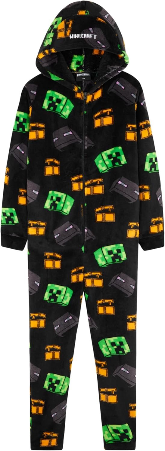 Minecraft Boys Fleece Hooded One-Piece Pajamas, Warm Fleece Hooded Loungewear Suit for Boys – Gifts for Gamers