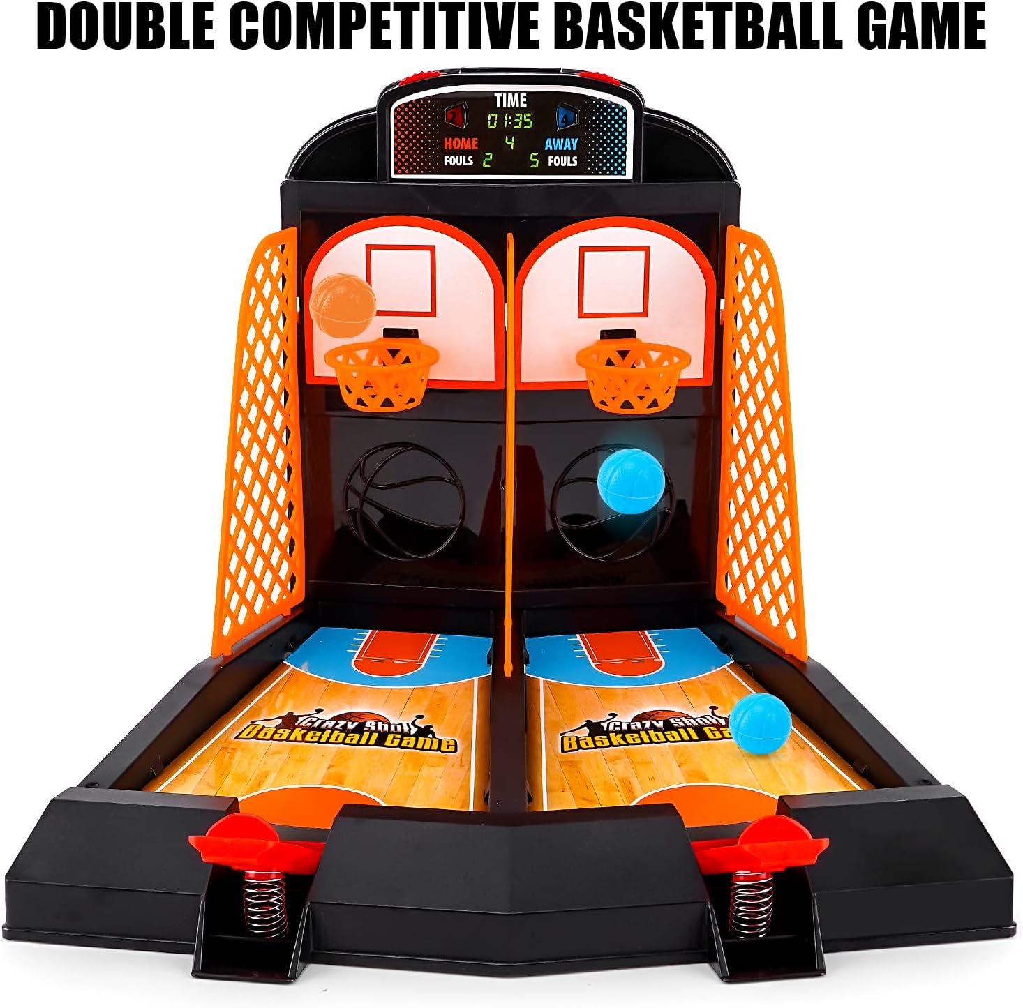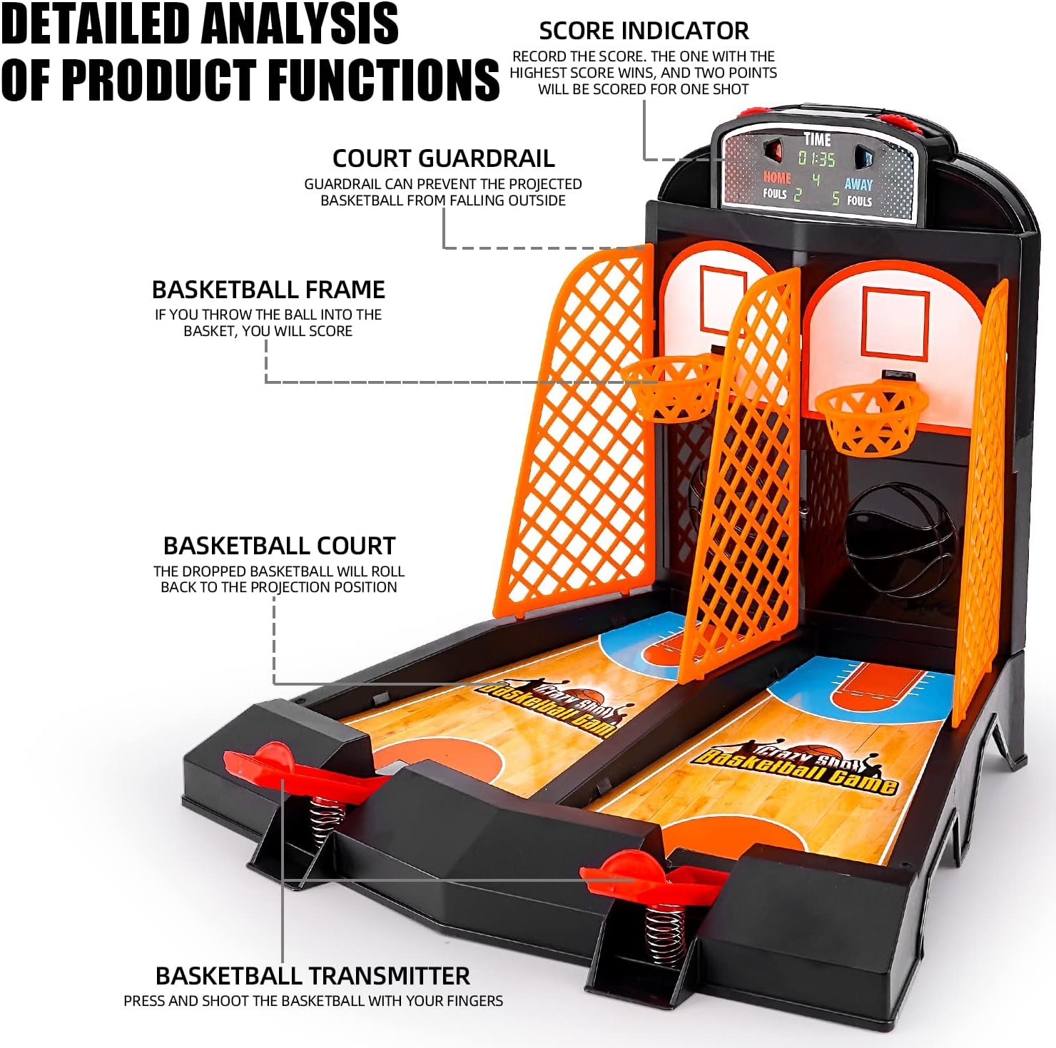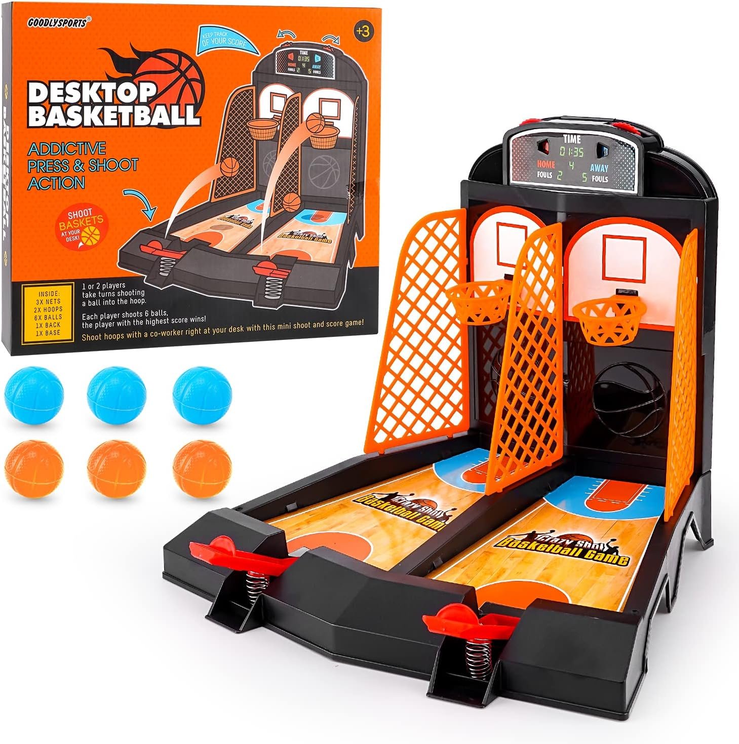 Desk Toys: This toys and games include 1 court, 1 rebound with built-in score keeper, 2 frames , 3 fences, 6 balls. The desktop games is designed as basketball gifts and desk games for office for adults