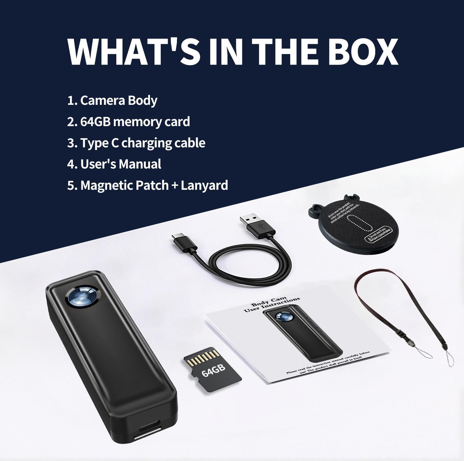 [What’s in the Box] 1x A100 Body Camera , 1x Magnetic Neck Strap, 1x Data Charging Cable and 1x User Manual