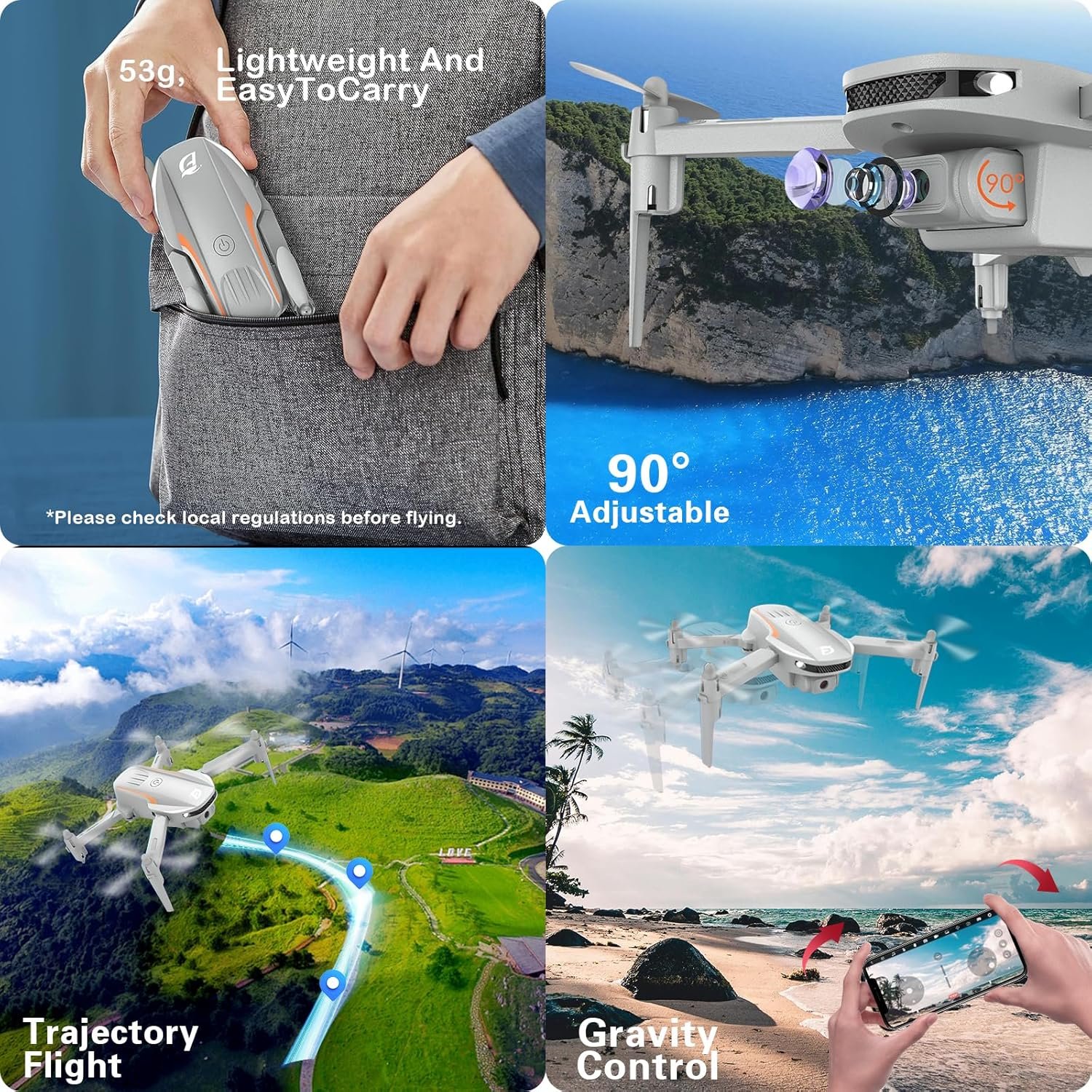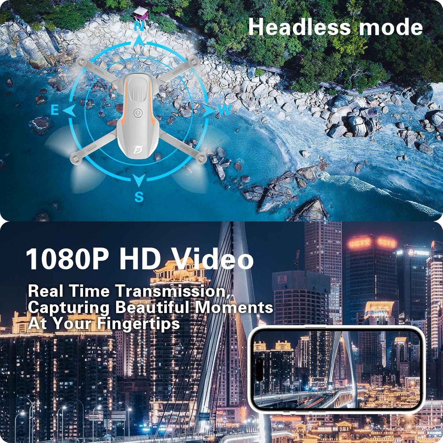 ✈【1080P HD Camera】1080P HD Camera – Equipped with a 1080P HD 90° adjustable lens, combined with the hover system and optical flow positioning technology, our camera drone is more stable when shooting. It assists you to catch the wonderful moment from a birds-eye perspective. Using the “EEFPV” app and FPV transmission, Enjoy the thrill of exploring distant landscapes while flying, you can enjoy live 1080P HD pictures and videos and easily share with your friends and family.