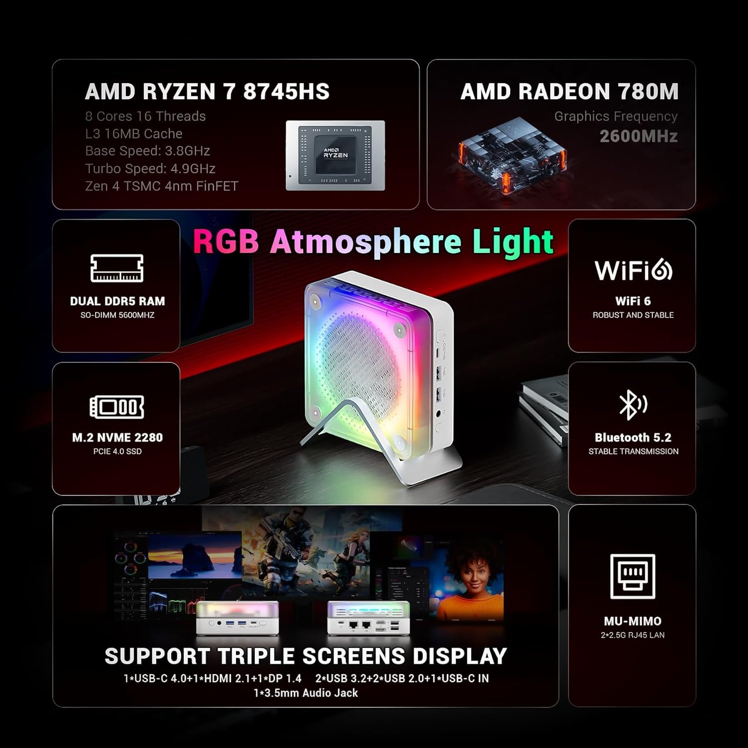 Mini Gaming PC Computer【MN56】AMD Ryzen 7 8745HS(8C/16T, up to 4.9GHz), 32GB(2x16GB) DDR5 1TB PCIe 4.0 SSD, Small Mini Desktop Computer, 4K Triple Display, BT5.2/WiFi 6/USB4/Dual LAN 2.5G RJ45