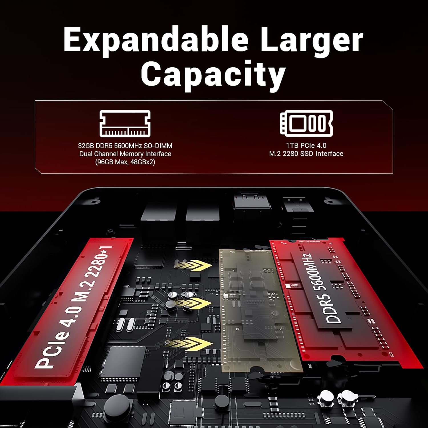 【Dual Channel 32GB DDR5 5600MHz Memory 1TB PCIe 4.0 SSD】FIREBAT MN56 Mini Computer is equipped with a high-speed dual-channel 32GB(2x16GB) DDR5 5600MHz and an M.2 1TB PCIe 4.0 SSD, which allows the small PC to run multiple high-performance operations simultaneously. If you want more storage space, the SSD has an M.2 2280 PCIE4.0x4 SSD interface, expanding the memory upgrade storage to 4TB to meet your needs!