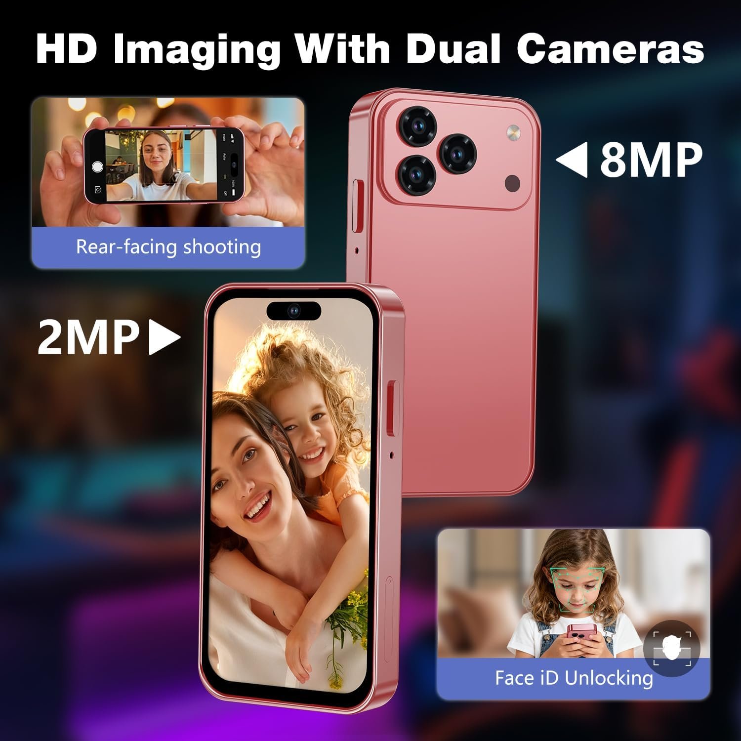 【Enhanced Security & Dual Cameras】Unlock your phone instantly with advanced facial recognition technology. Equipped with a 2MP front and 8MP rear camera, this mini phones supports 1080P video calls and captures all your daily moments clearly, making it perfect for keeping families connected anytime, anywhere.