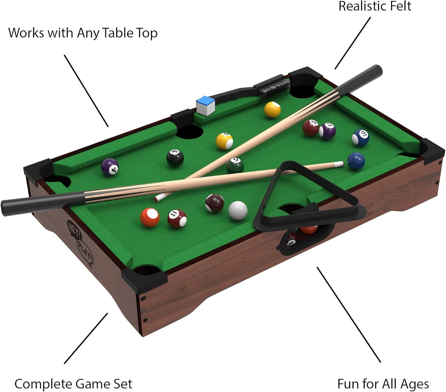 20-INCH POOL TABLE – This game table comes with all the pool table accessories you need for complete game play, including 2 cue sticks, (16) 1-inch mini pool balls, chalk, a triangle rack, as well as a brush to keep the felt top lint-free.