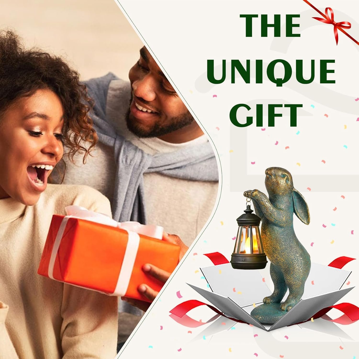 Rabbit with Solar Lantern: The bronze rabbit statues hold a solar lantern, which casts a warm and welcoming glow. The light mimics a vivid small flame and flashes in the breeze. As the symbol of good luck, joy, and prosperity, the rabbit figurines are ideal for creating a warm atmosphere in the patio, yard, and porch.