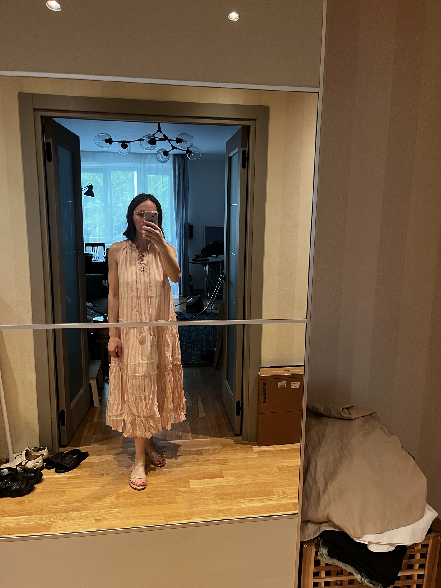 excellent, for height 160. The fabric is pleasant, the shade is beige with white. Classic departure