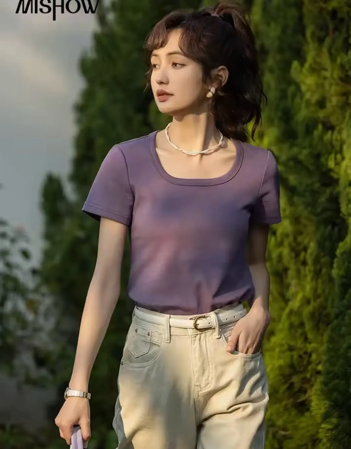 15 reviews for MISHOW Short Sleeve T-shirts Women Spring Solid Square-neck Top Elegant Woman Clothes Office Lady Cotton Tees MXC12T0641