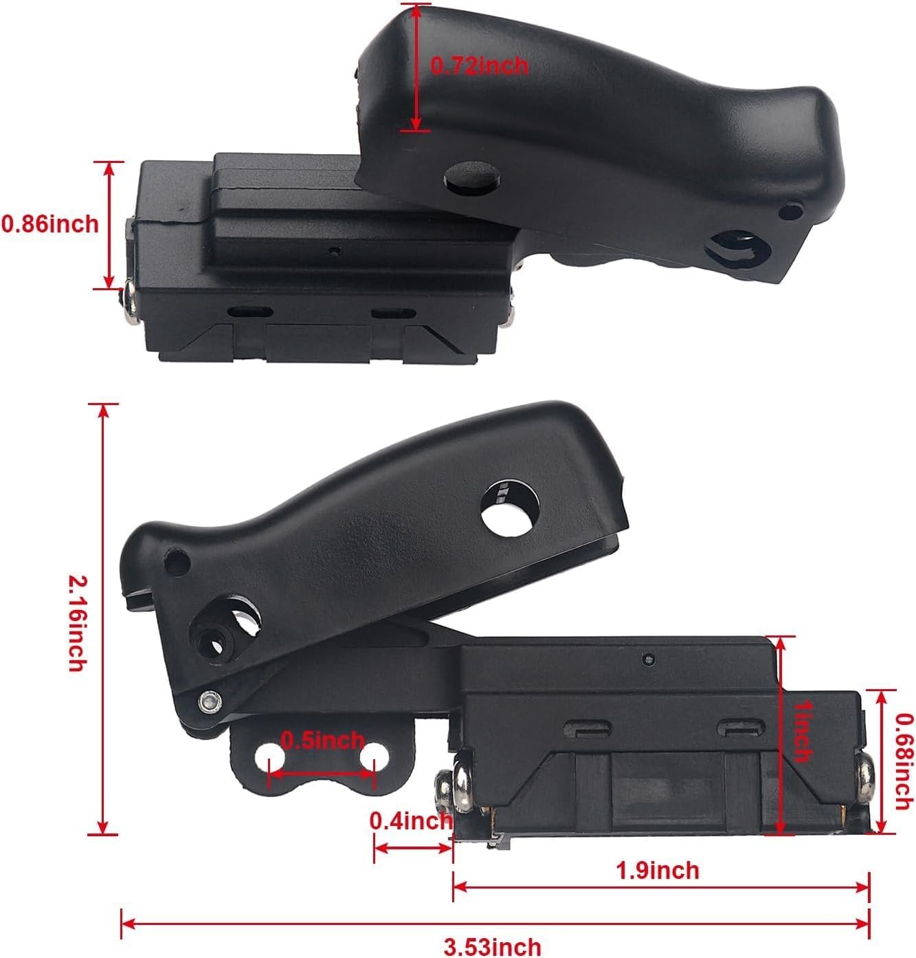 【Function】 This trigger switch are common replacement parts in power tools. It is a suspension trigger switch with a large push button. It handles all on/off and variable speed functions. It also have a power-off feature that instantly reverses electrical polarity.