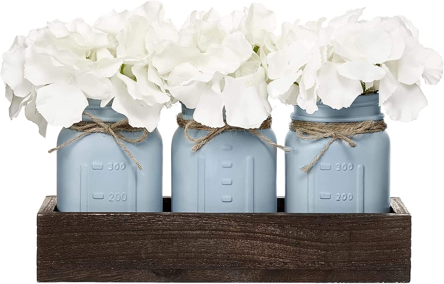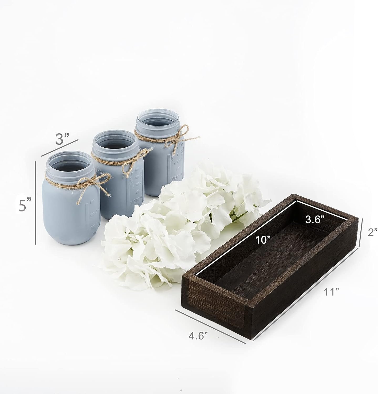 Farmhouse Centerpieces for Table: This decorative mason jars with wood tray is a soft and gorgeous color mason jars Centerpiece! Perfect for decorative your dining room counter table or adding rustic style to your room