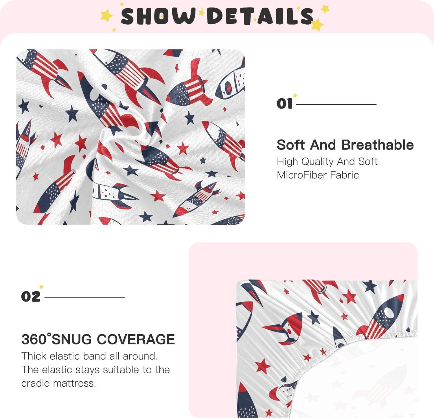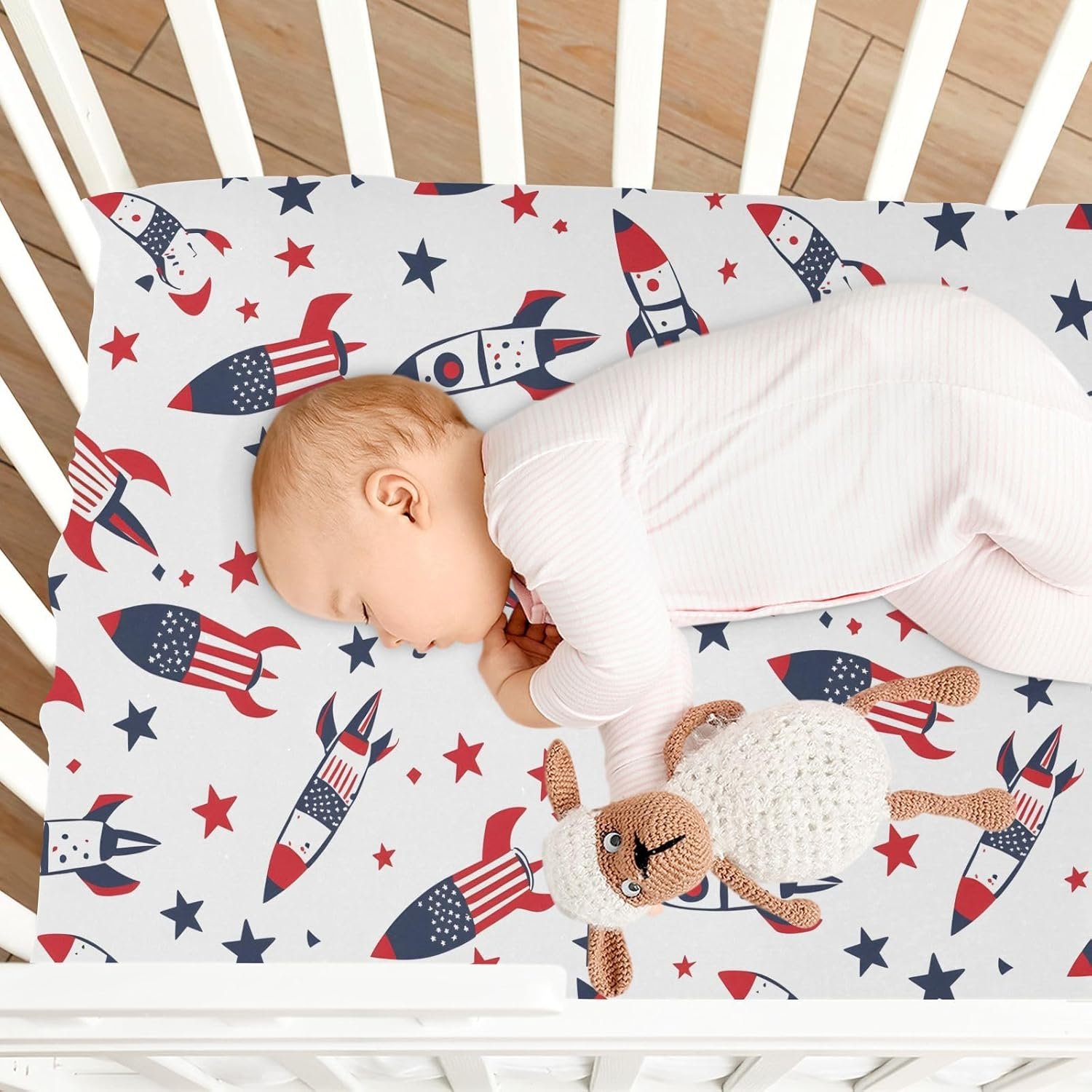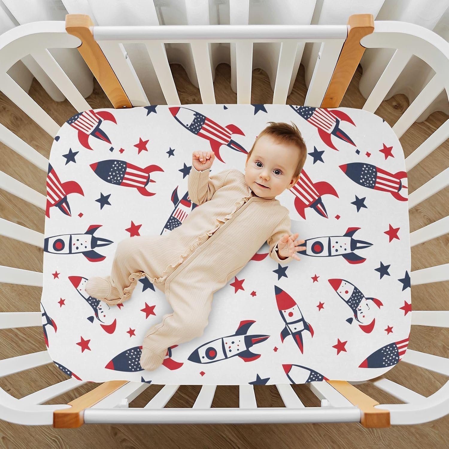 MNSRUU Baby Crib Sheets for Boys Girls, Rocket American Flag White Soft Breathable Fitted Bassinet Playard Bed Sheet for Standard Crib and Toddler Mattress Playard Bedding, 39x27x5in