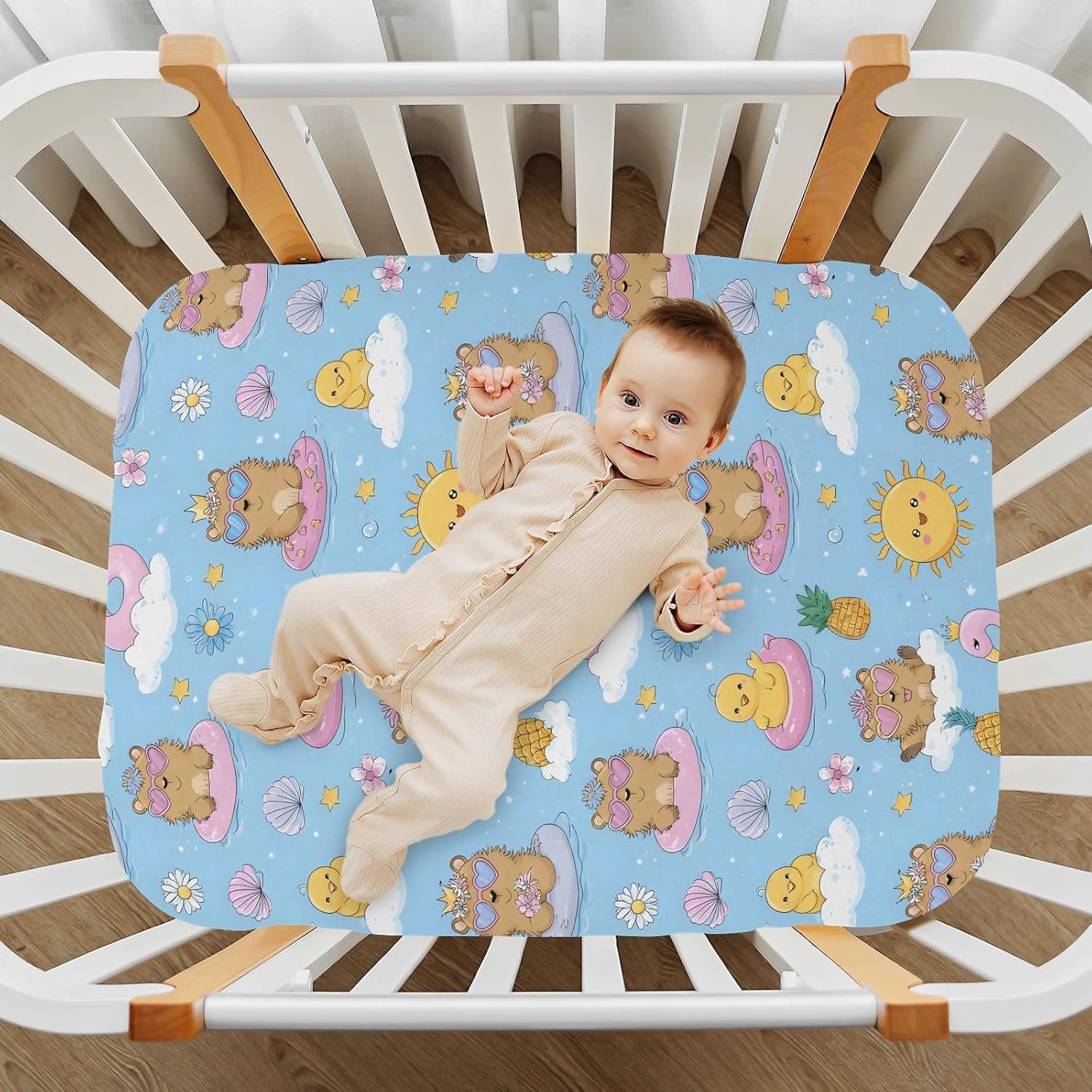 Super Soft & Breathable Fabric: Crafted from cotton-modal-like blend (95% polyester + 5% spandex), this baby crib sheets provide an ultra-soft, skin-friendly surface that’s gentle even on the most sensitive baby skin. Breathable and moisture-wicking, these crib sheets help regulate temperature throughout the night—ideal for all seasons. Whether your baby is napping or playing, ensures all-day comfort and restful sleep