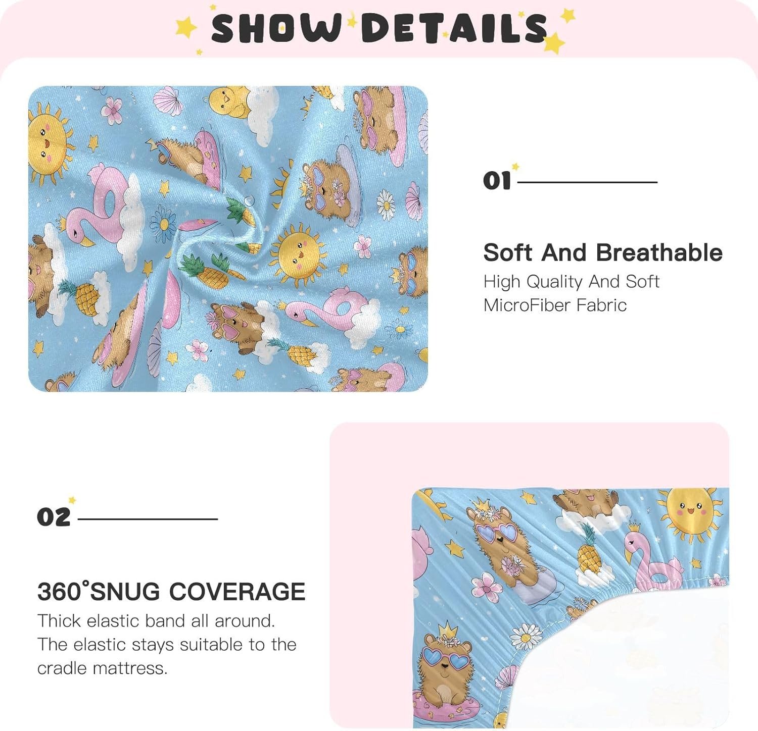 Available in Two Sizes to Fit Your Nursery Needs: Our crib bassinet sheets are available in two sizes: Size S (25x24x4cm) fits smaller cribs or bassinets, while Size M (28x34x6.5cm) fits most standard crib and pack n play mattresses. A perfect fit wherever your baby rests or plays,making them versatile for home, travel cribs, playards, and more