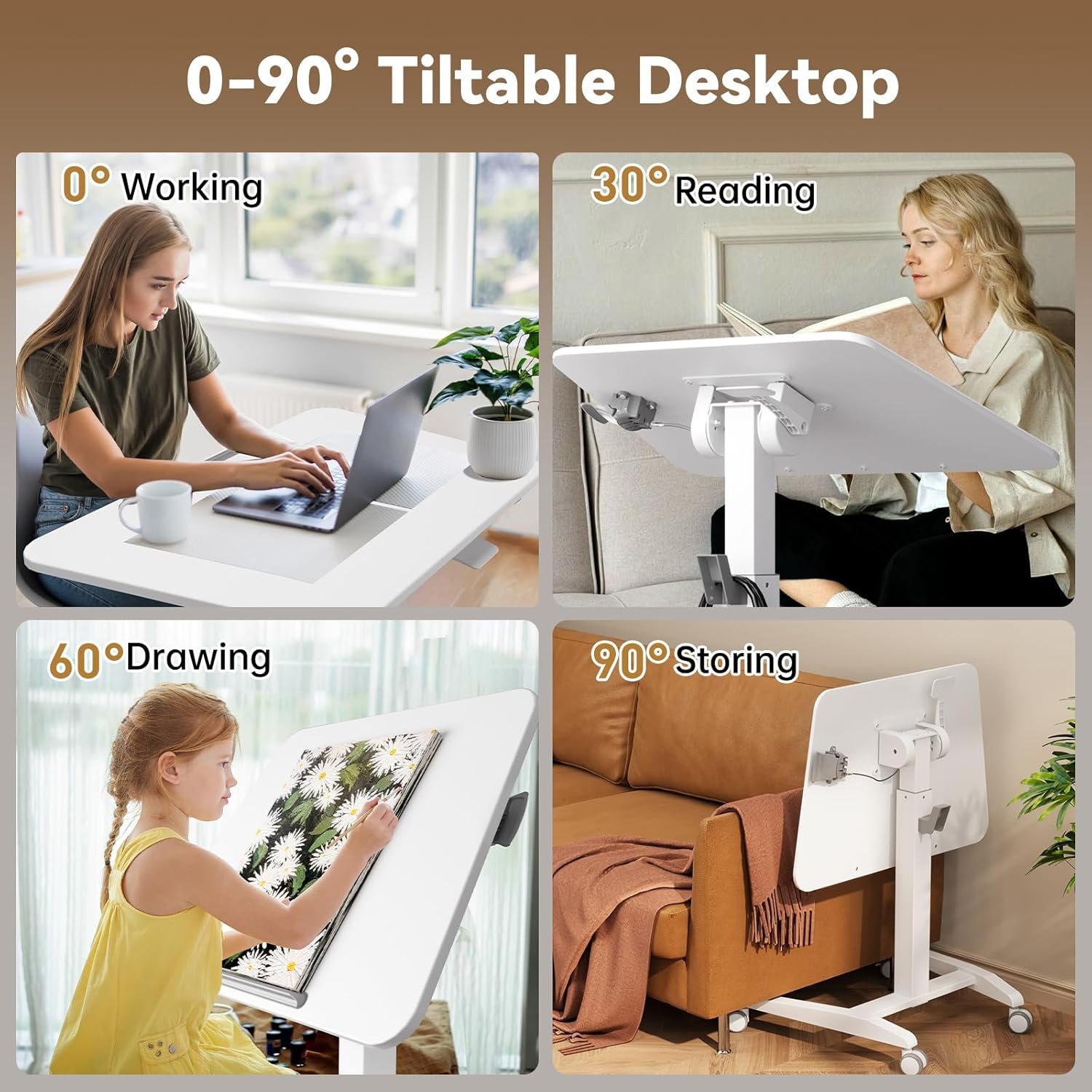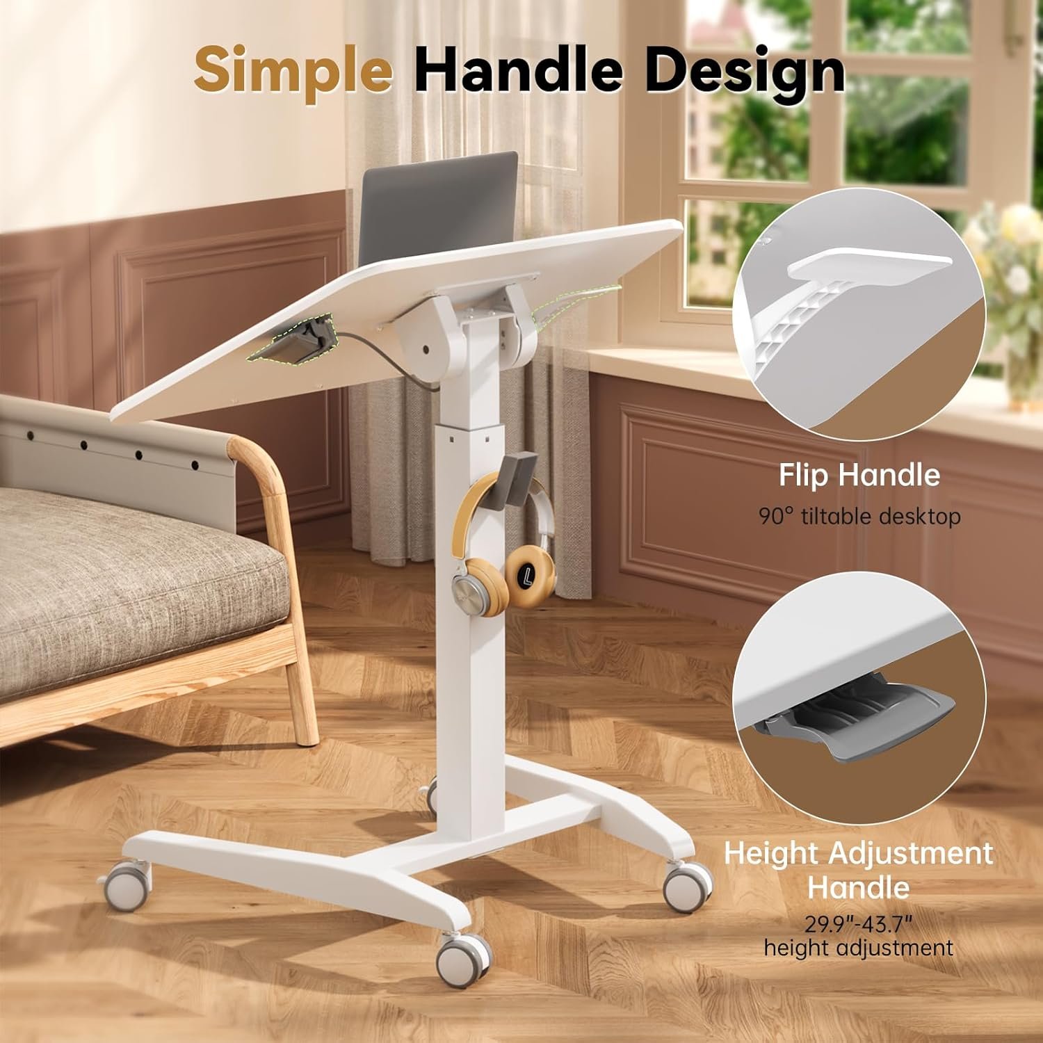 Tilting Desktop — Featuring 0° to 90° tilt, the rolling standing desk provides ideal typing angles at the squeeze of a handle. When fully tilted at 90°, it can be stored next to the bed or sofa to save space