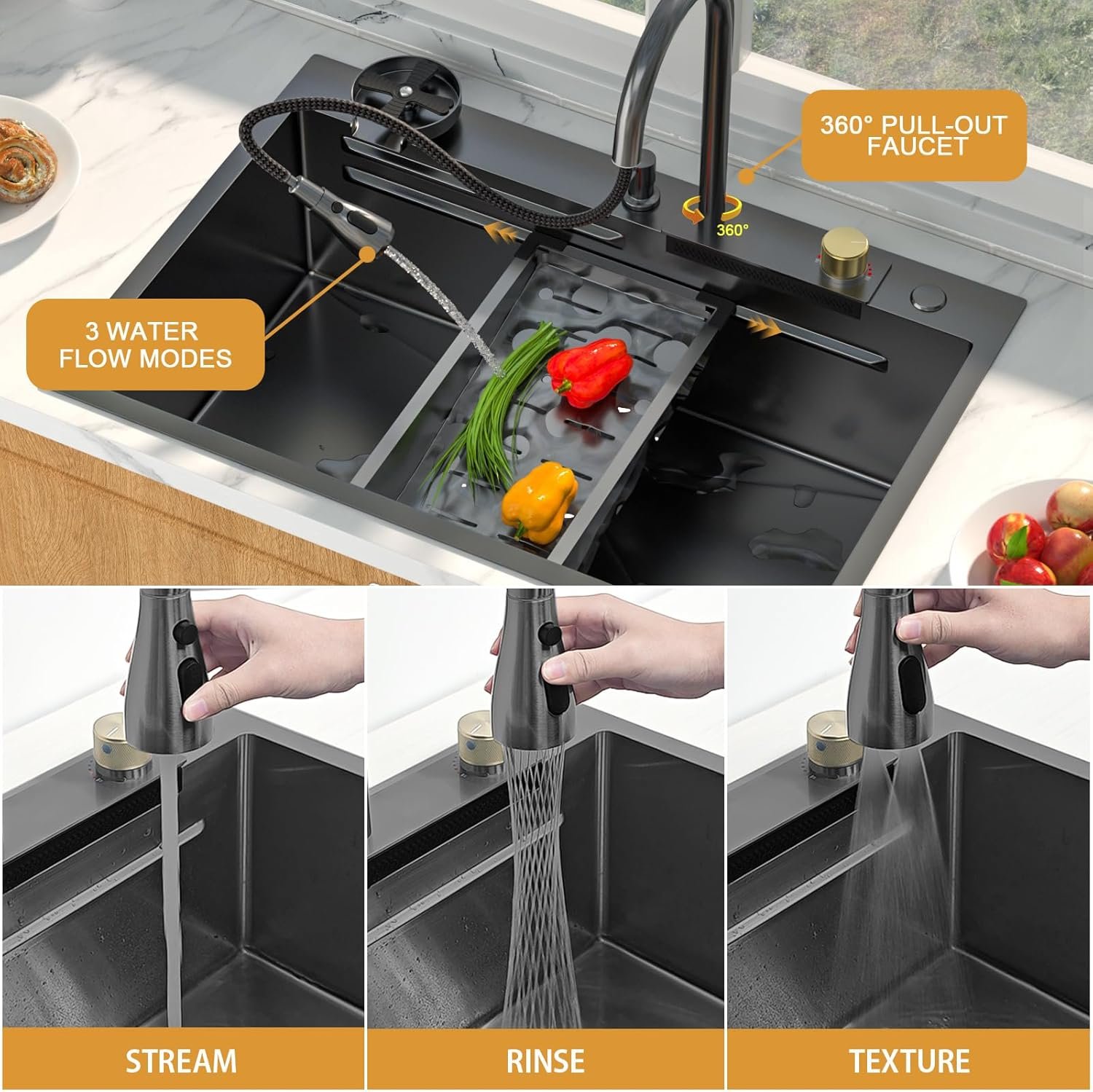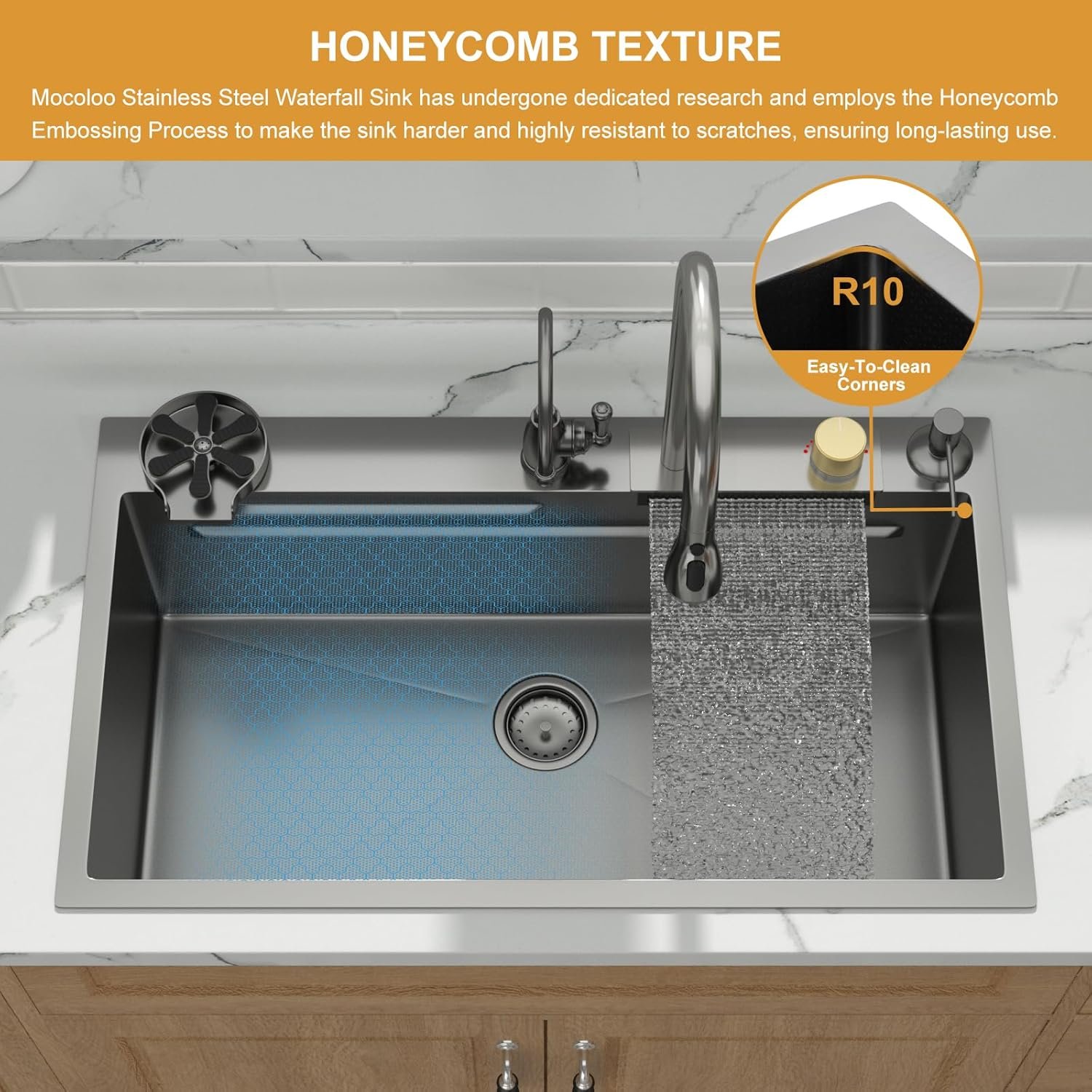 【ADVANCED NANO-COATED HONEYCOMB STEEL】 Experience the next generation of stainless steel. Our black waterfall kitchen sink is crafted from ultra-thick 16-Gauge T304 steel, then coated with an embossed honeycomb nano-texture. This advanced surface is not only beautiful but also offers superior scratch resistance, rapid heat dissipation, and is incredibly easy to clean, keeping your smart kitchen sink looking pristine for years.