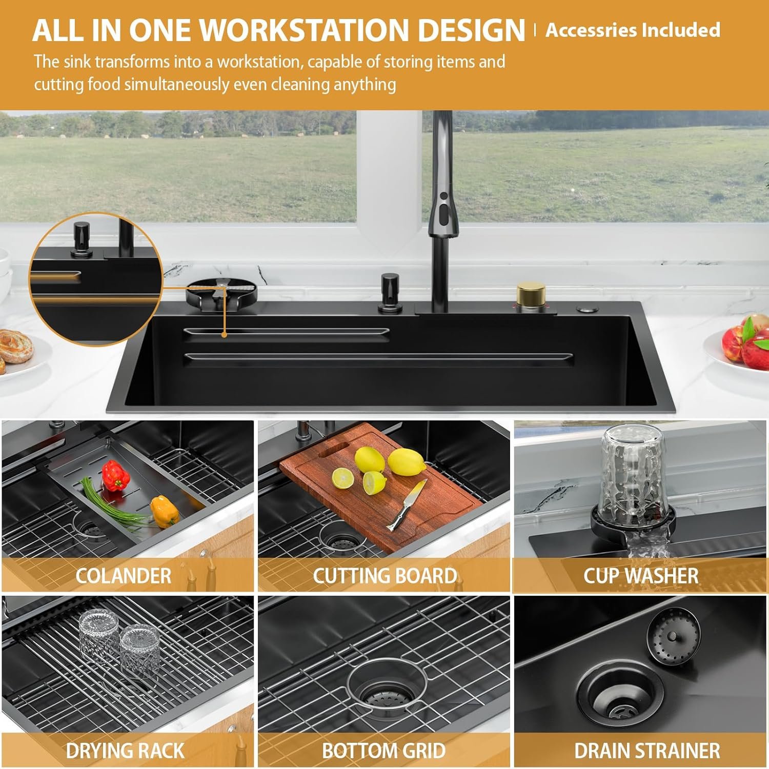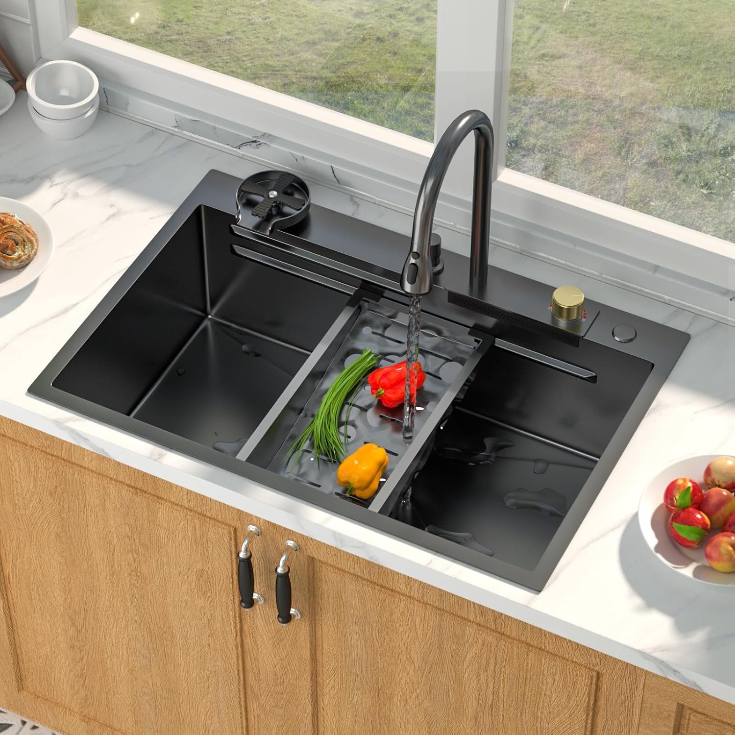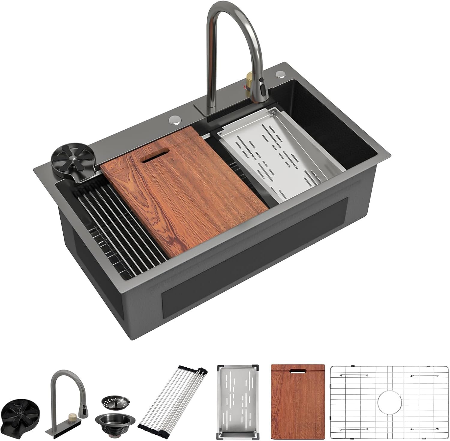 【THE COMPLETE KITCHEN WORKSTATION】 More than just a sink, this is your complete kitchen workflow hub. This 33 inch black drop in kitchen sink integrates a 360° pull-out faucet, an innovative waterfall spout, a high-pressure cup washer, and a full set of built-in accessories. The dual-track ledge system allows you to prep, wash, and dry all in one place, streamlining your kitchen tasks and freeing up valuable counter space.