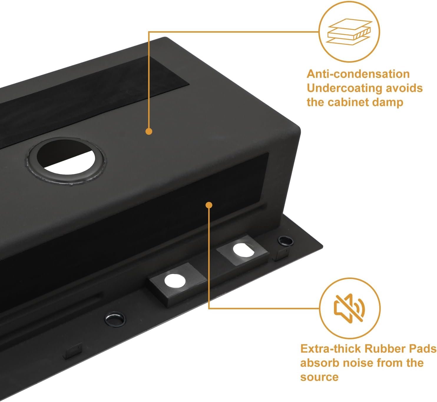 【ENGINEERED FOR A QUIET & CLEAN KITCHEN】 Enjoy a more serene kitchen environment. This 33” black smart kitchen sink is heavily padded with 3mm thick sound-dampening pads and a protective undercoating to absorb noise and prevent condensation. The basin features a sloped bottom and X-channel grooves for fast, complete drainage, while R10 tight-radius corners ensure no grime buildup and make cleaning effortless.