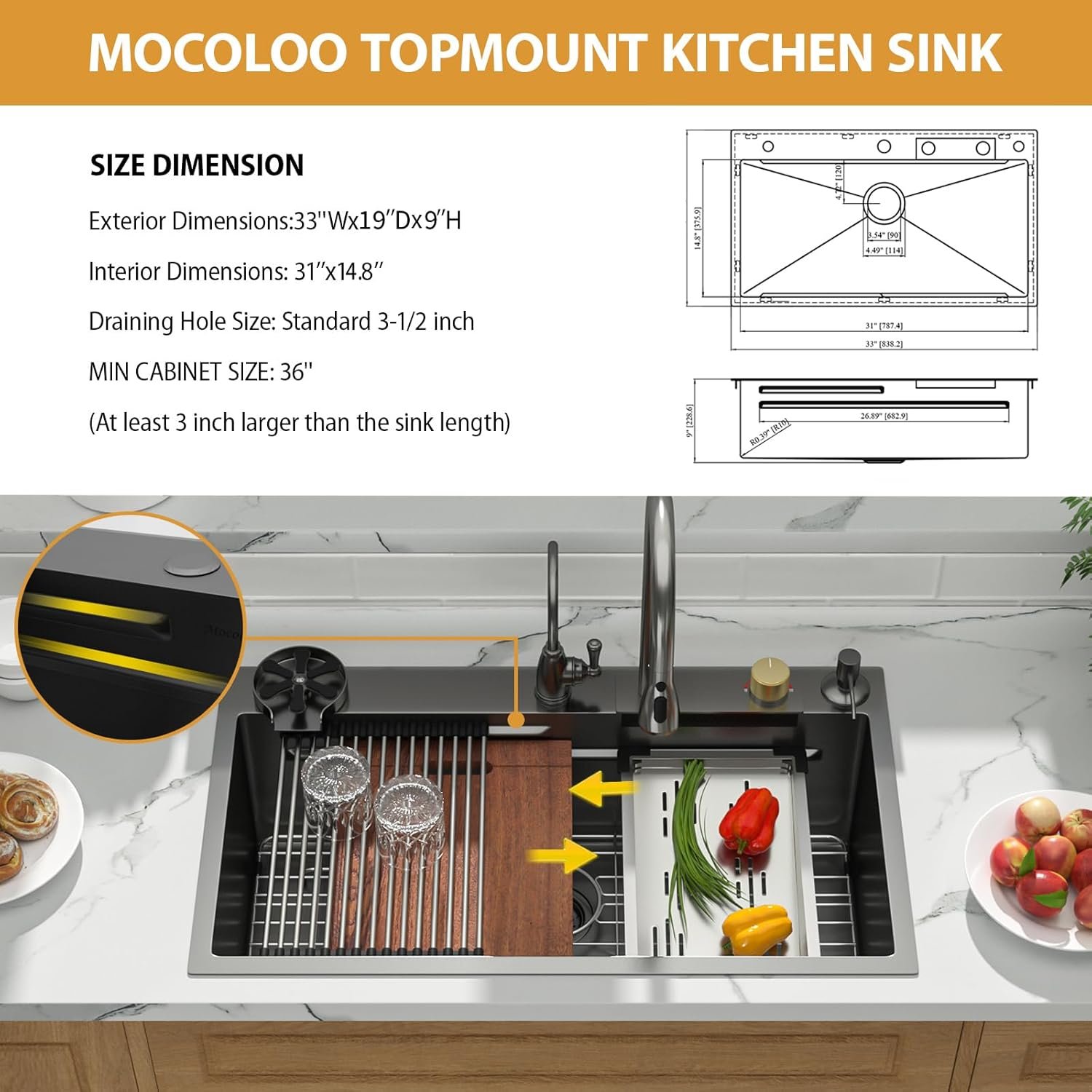 【GENEROUS SIZE & COMPLETE ACCESSORY KIT】 Exterior size is 33″W x 19″D x 9″H (fits min. 36″ cabinet); Interior is 31”W x 14.8”D x 8.75”H. The standard 3.5″ drain fits most garbage disposals. —PACKAGE INCLUDES— a black kitchen sink with faucet combo, a solid red wooden cutting board, a deep colander, a bottom rinse grid, a roll-up rack, a gunmetal black faucet assembly, a basket drain assembly, and hot/cold water hoses. (Note: Soap dispenser and water purifier faucet are not included).