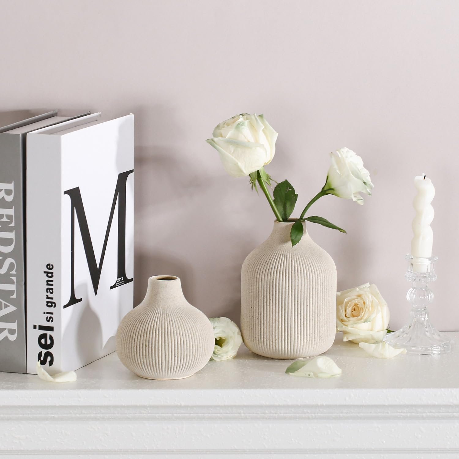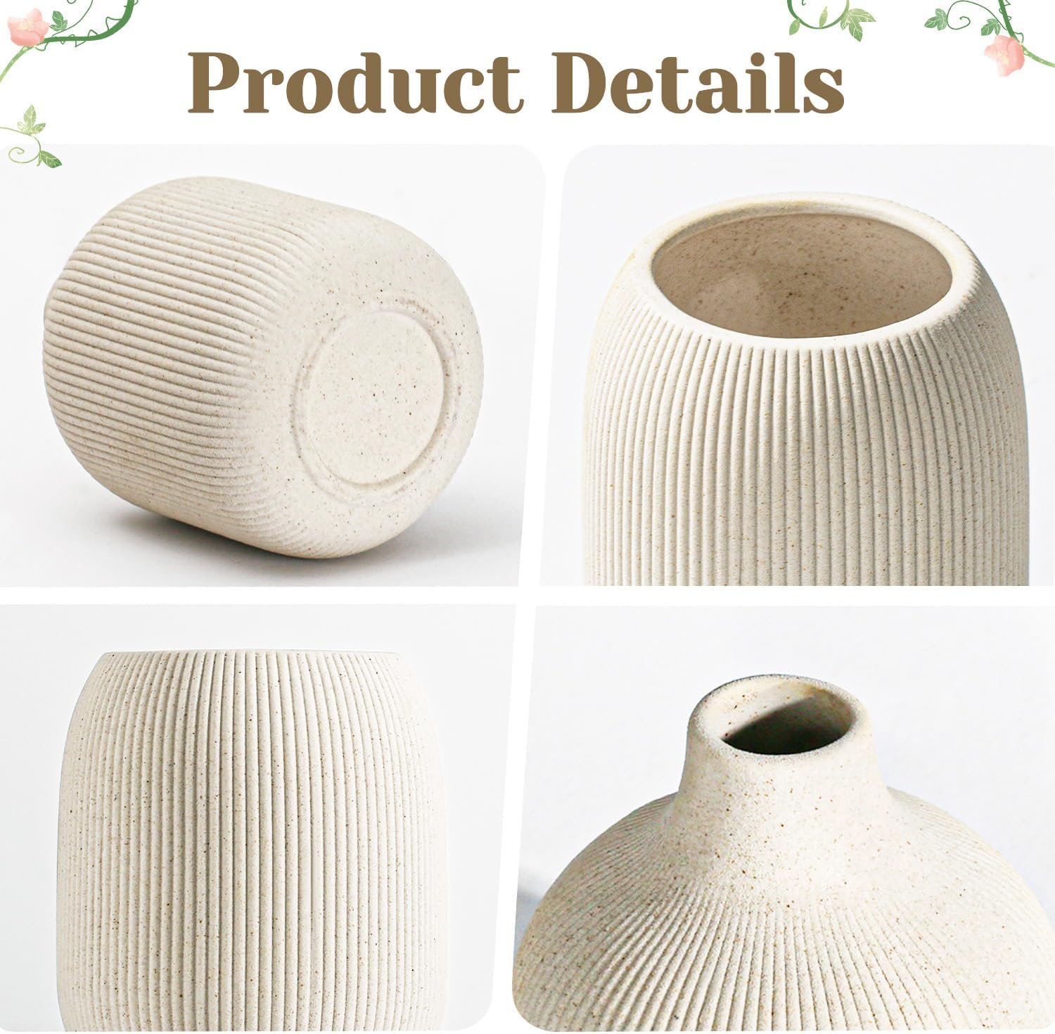 Modern Beige Ceramic Vase Set of 3, Ribbed Texture Boho Minimalist Home Decor, Small Decorative Vases for Centerpiece, Shelf, Tabletop – Aesthetic Touch for Neutral & Transitional Spaces