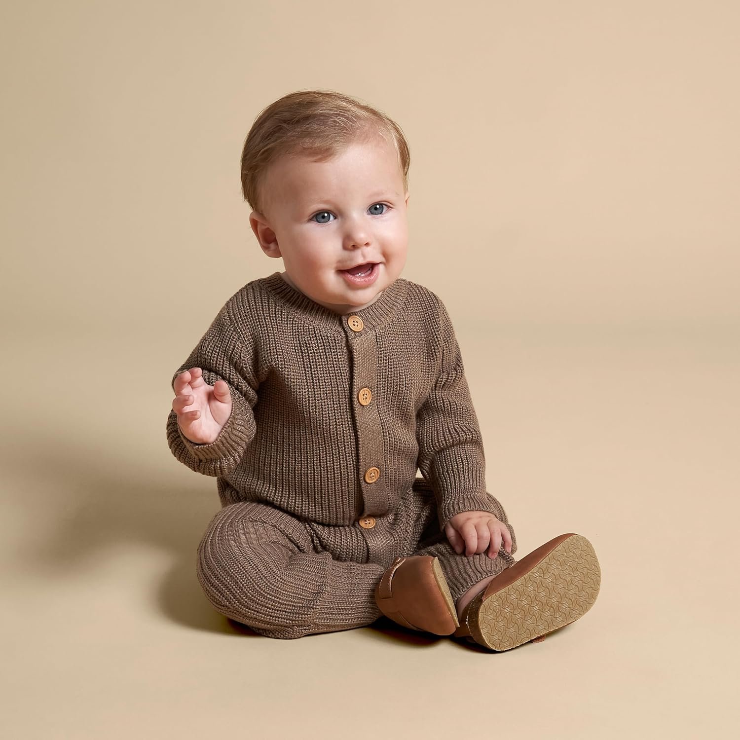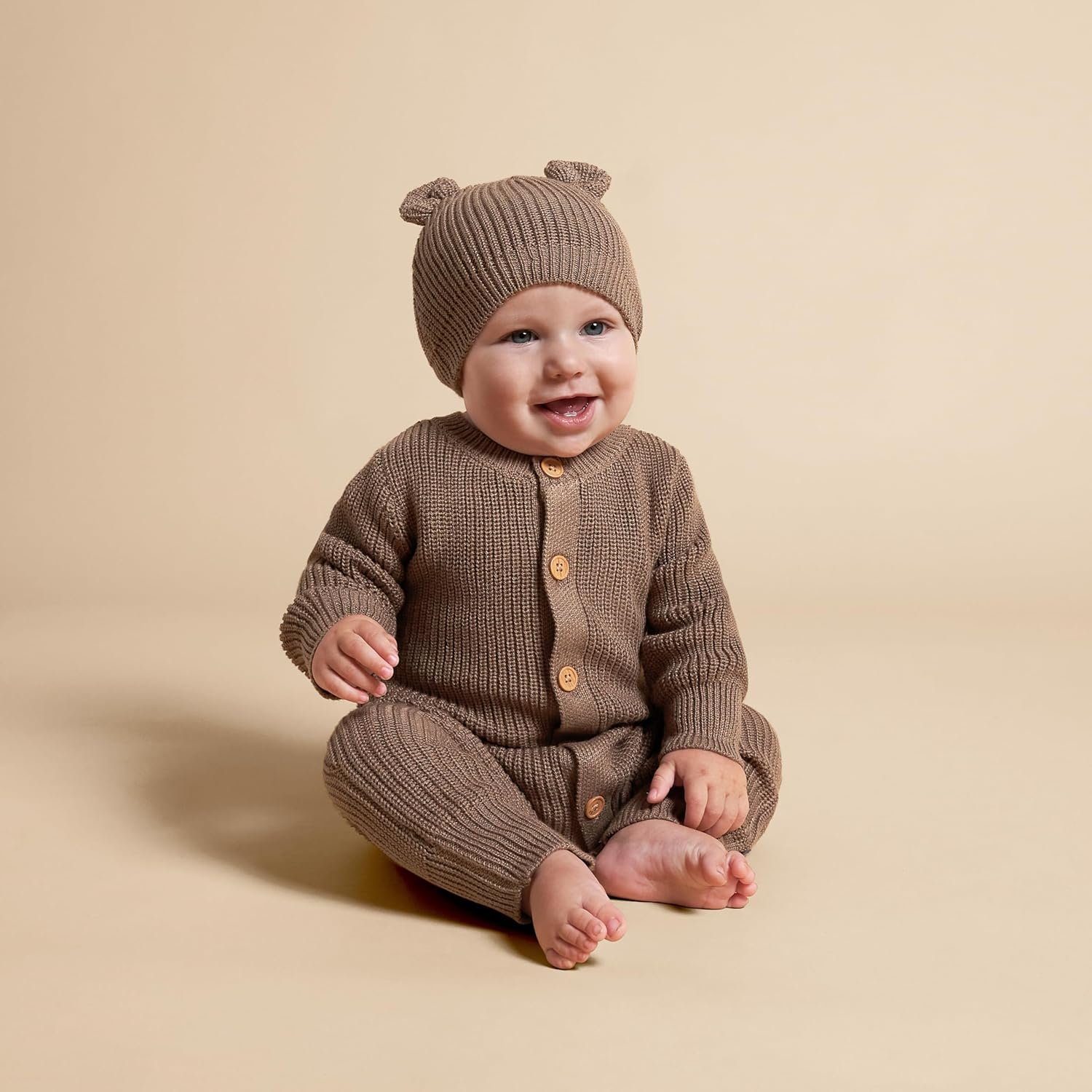 Dress your little one in cozy cuteness with our baby romper and hat set! Made from thick, warm material with a gentle stretch, this ensemble is perfect for keeping your baby snug and happy. With hidden snaps at the inseam, dressing and diaper changes are quick and convenient, while comfort-stretch ribbing at the neckline, wrists, and ankles ensures a comfortable fit that moves with your baby. And when it’s time for outdoor adventures, the matching hat adds an extra layer of warmth and style. Complete with faux wood buttons for a whimsical touch, this set is a delightful addition to your baby’s wardrobe.