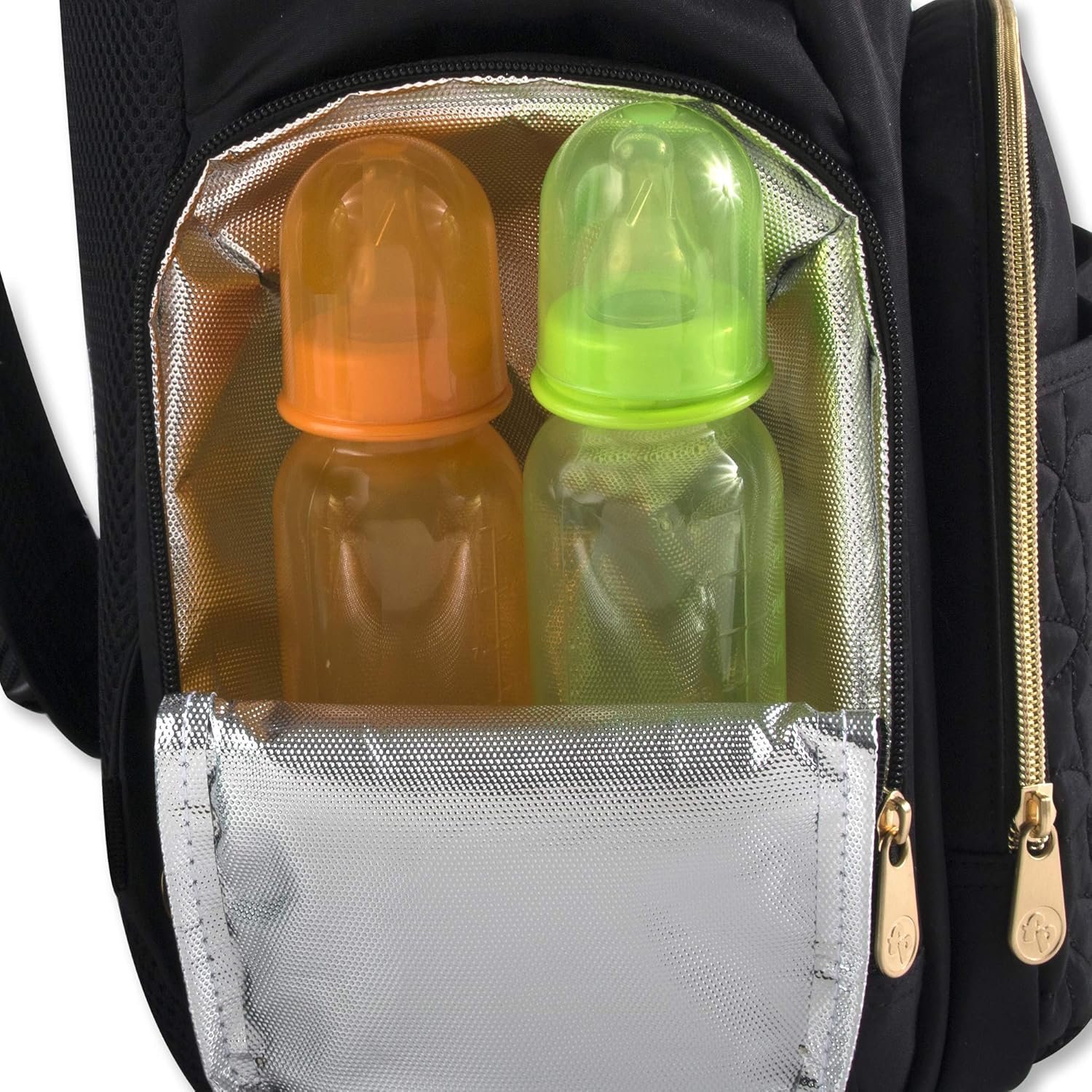 Customers find the diaper bag spacious with pockets for everything, and one mentions the insulated side pocket for bottles. The bag receives positive feedback for its style, with one customer particularly appreciating the black with gold zipper accents. Customers praise its easy access features, with one noting the convenient wipe container on the side.