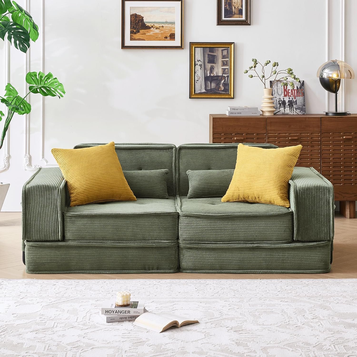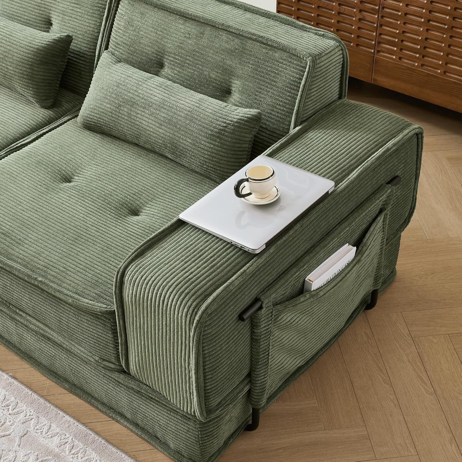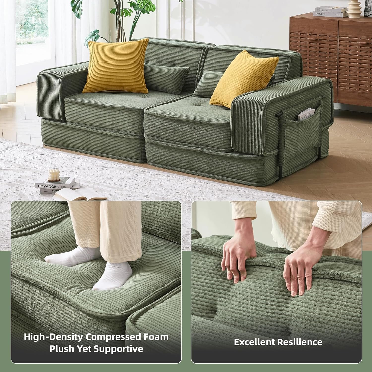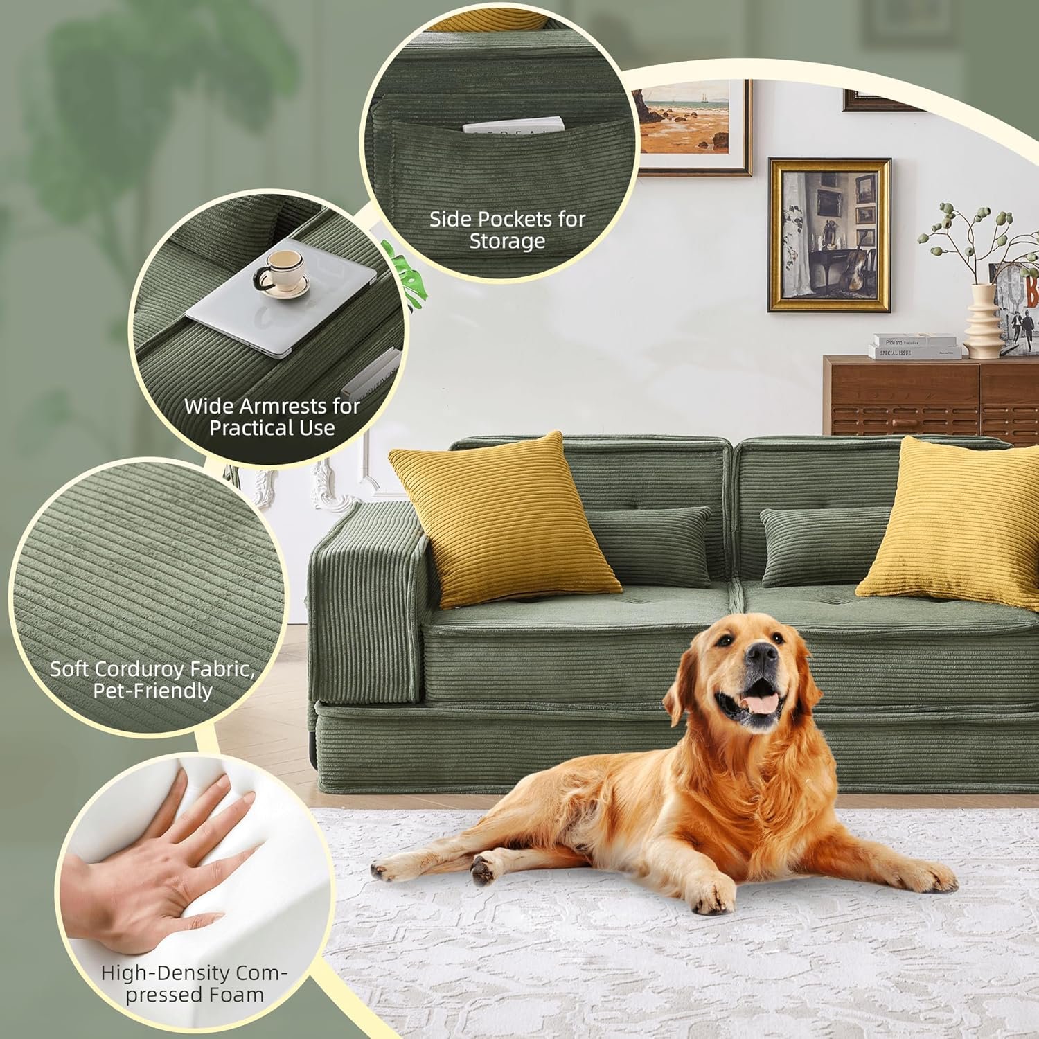 NO Wood Eco & Pet-Friendly Design: Crafted with 0% wood materials to help preserve forests and reduce deforestation. Every purchase contributes to saving trees and protecting natural ecosystems. Combined with stain-resistant corduroy fabric that repels spills and pet hair, plus a non-slip base for hardwood floor stability, this couch delivers a pet-friendly, kid-proof, and planet-friendly solution for active households