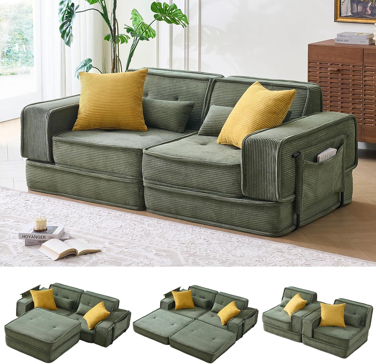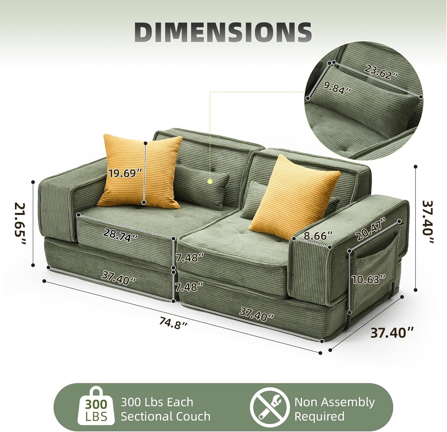 Modular Sofa Bed, No Assembly Required Sectional Couch for Living Room, Compressed Cloud Couch with Corduroy Fabric & Lumbar Pillows, Small Space Furniture Green