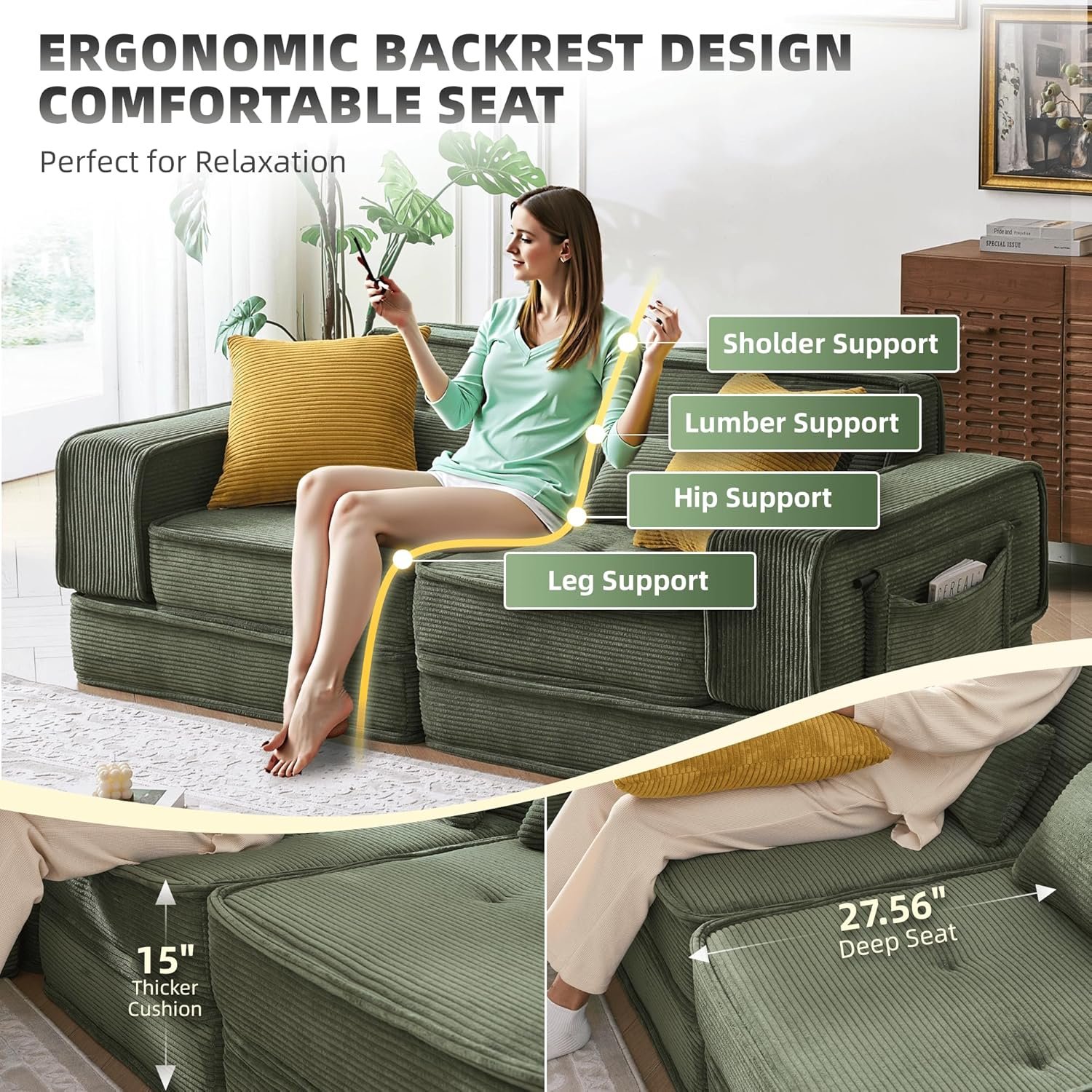 Premium Corduroy & High-Density Sponge: Upgraded 30% thicker corduroy fabric paired with pressure-resistant polymer foam prevents sagging. The 15″ thick cushions and 27.5″ deep seats provide cloud-like comfort with built-in lumbar support for all-day lounging