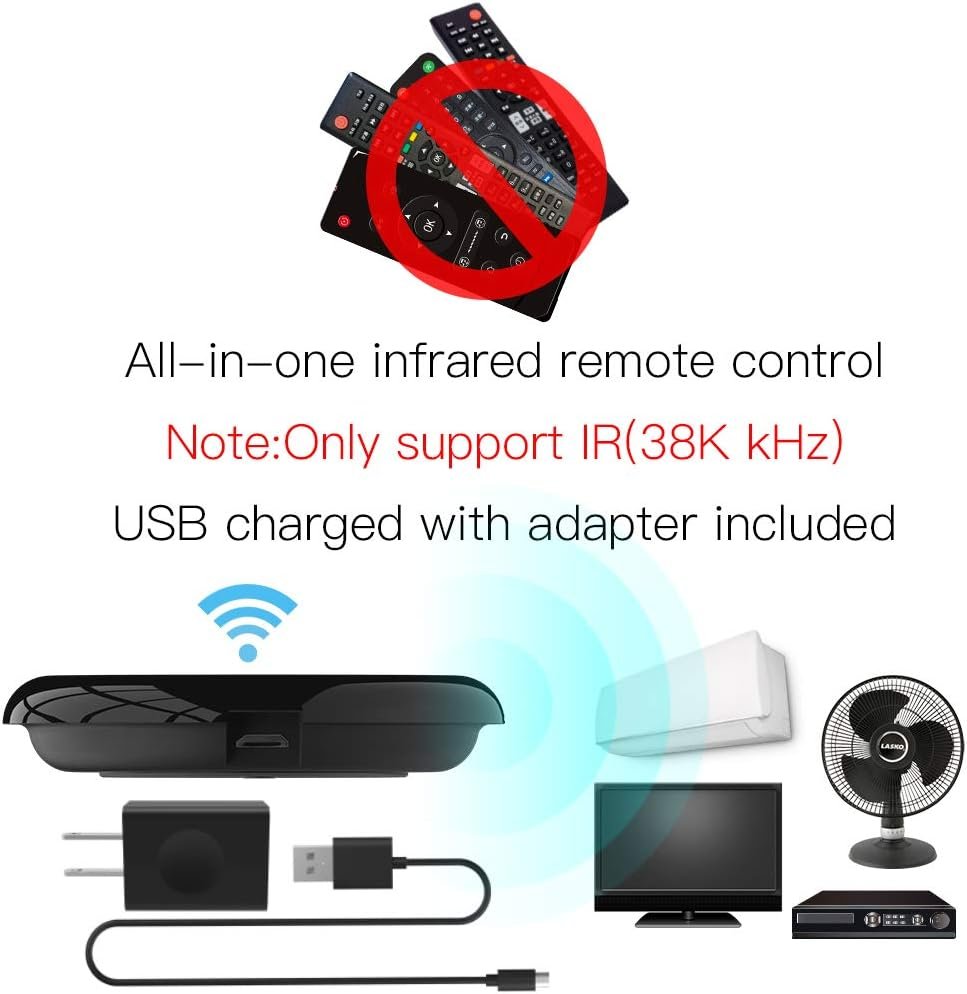 This device is only compatible with 38 kHz IR, so ensure compatibility before purchase. Best to use in just one room. Supports only 2.4G Wi-Fi connection, Android 4.4 and above or iOS 8.0 and above.Includes USB 2.0 cable for flexible use ( adapter included)