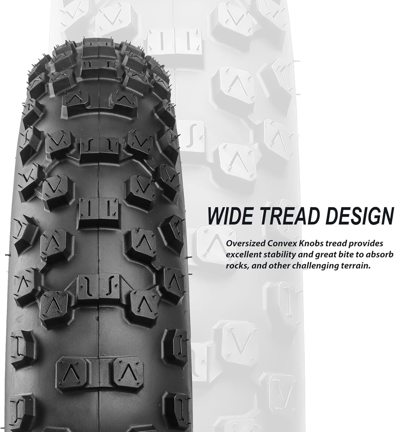 Oversized Convex Knobs tread provides excellent stability and great bite to absorb rocks, and other challenging terrain.